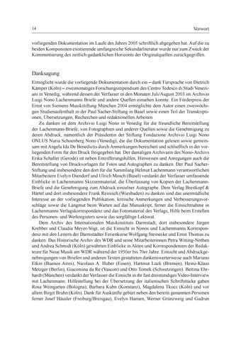 Danksagung Ermöglicht wurde die vorliegende Dokumentation durch ein – dank Fürsprache von Dietrich Kämper (Köln) – zweimonatiges Forschungsstipendium des Centro Tedesco di Studi Veneziani in Venedig, während dessen der Verfasser in den Monaten Juli/August 2003 im Archivio Luigi Nono Lachenmanns Briefe und andere Quellen einsehen konnte. Ein Förderpreis der Ernst von Siemens Musikstiftung München 2004 ermöglichte dem Autor einen zweiwöchigen Studienaufenthalt in der Paul Sacher-Stiftung in Basel sowie einen Teil der Transkriptionen, Übersetzungen, Recherchen und redaktionellen Arbeiten. Zu danken ist dem Archivio Luigi Nono in Venedig für die freundliche Bereitstellung der Lachenmann-Briefe, von Fotographien und anderer Quellen sowie die Genehmigung zu deren Abdruck, namentlich der Präsidentin der Stiftung Fondazione Archivio Luigi Nono ONLUS Nuria Schoenberg Nono (Venedig), die die Dokumentation gelesen sowie gemeinsam mit Angela Ida De Benedictis durch Anmerkungen bereichert und schließlich in der vorliegenden Form für den Druck freigegeben hat. Der damaligen Archivarin des Nono-Archivs Erika Schaller (Gerode) ist neben Entzifferungshilfen, Hinweisen und Anregungen auch die Bereitstellung von Druckvorlagen für Fotos und Autographen zu danken. Der Paul SacherStiftung und insbesondere den dort für die Sammlung Helmut Lachenmann verantwortlichen Mitarbeitern Evelyn Diendorf und Ulrich Mosch (Basel) verdankt der Verfasser umfassende Einblicke in Lachenmanns Skizzenmaterial, die Überlassung von Kopien der LachenmannBriefe und die Genehmigung zum Abdruck einzelner Autographe. Dem Verlag Breitkopf & Härtel und dort insbesondere Frank Reinisch (Wiesbaden) zu danken sind das unermüdliche Interesse an der vorliegenden Publikation, kritische Anmerkungen und Verbesserungsvorschläge sowie die Langmut beim Warten auf das Manuskript, ferner die Einsichtnahme in Lachenmanns Verlagskorrespondenz und das Fotomaterial des Verlags, Hilfe beim Erstellen des Personen- und Werkregisters sowie das sorgfältige Lektorat. Dem Archiv des Internationalen Musikinstituts Darmstadt, dort insbesondere Jürgen Krebber und Claudia Meyer-Vogt, ist die Einsicht in Nonos und Lachenmanns Korrespondenz mit den Leitern der Darmstädter Ferienkurse Wolfgang Steinecke und Ernst Thomas zu danken. Das Historische Archiv des WDR und seine Mitarbeiterinnen Petra Witting-Nöthen und Andrea Schmidt (Köln) gewährten Einblicke in Akten und Korrespondenzen der Redakteure für Neue Musik am WDR während der 1950er bis 70er Jahre. Einsicht und Abdruckgenehmigungen von Briefen und anderen Texten gestatteten dankenswerterweise auch Mariano Etkin (Buenos Aires), Nicolaus A. Huber (Essen), Hartmut Lück (Bremen), Heinz-Klaus Metzger (Berlin), Giacomina da Re (Vascon) und Otto Tomek (Schwetzingen). Bettina Ehrhardt (München) verdankt der Verfasser die Einsicht in ihr fast dreistündiges Video-Interview mit Lachenmann. Hilfestellung bei der Übersetzung der italienischen Schriftstücke gaben Rosa Weingarten (Bologna), Barbara Kuhn (Konstanz), Magdalena Tkocz (Köln) und vor allem Birgit Bruhn (Köln). Dank für Auskünfte gebürt neben den bereits genannten Personen ferner Josef Häusler (Freiburg/Breisgau), Evelyn Hansen, Werner Grünzweig und Gudrun