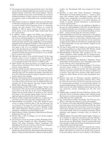 XVIII 10 The arrangement was briefly mentioned by the critic in Uusi Suomi on the same day. Hufvudstadsbladet did not review the concert at all. Helsingin Sanomat, 4 December 1935, U[uno] K[lam]i: “Yleisesti laulettu joululaulu ‘En etsi valtaa, loistoa’ kuultiin nyt ensi kerran mieskuorosovituksena. Uudessa asussaan soi se hivelevän pehmeänä ja kauniina, mutta on ehkä jonkin verran menettänyt herkkyydestään.” 11 Opus number 18 appears in Sibelius’s work lists for the first time in 1905 (the list designated in SibWV p. 693 as “Sib 1905–09,” which is currently missing, and the beginning survives as a photocopy showing only opus numbers 1–21). However, in a work list published in 1902 by Euterpe magazine, the works of Op. 18 already appear in this order (except Veljeni vierailla mailla, which was composed later). 12 In addition, evidence suggests that Sibelius twice planned to include a tenth song in the opus. In the work list “Sib 1905–09,” Op. 18 has at some point appeared as 10 mieskuorolaulua [10 songs for male choir], with Hymn (Op. 21) being number 10. In 1914, Sibelius planned to add Herr Lager och Skön fager as a tenth work (the autograph work list designated in SibWV p. 694 as “Sib 1912–31”). Neither of the works was ever published as part of Op. 18, nor did they appear as Op. 18 in any published catalogue of Sibelius’s œuvre; thus, the plans were never realized. 13 The sub-numbers in Op. 21 were contradictory; in 1905–1909, both Isänmaalle and Hymn were placed second (either as 2 or b). Finally, Op. 21 consisted only of Hymn. 14 Although opus number 14 was intended primarily for the string orchestra version in most of Sibelius’s work lists, Sibelius did mention the choral versions of Rakastava in the context of Op. 14 in one autograph work list (“Sib 1912–31” in SibWV p. 694). 15 Martti Turunen asks about this detail in an undated letter (The National Library of Finland [=NL], Coll.206.31). Sibelius’s answer, however, remains unknown. 16 Cecil Gray, Sibelius (London: Oxford University Press, 1931), p. 207. Although Op. 18 appears in this form in the work lists Sibelius authorized after 1931, the outdated sub-numbers (especially those from 1911–1930) have continued to appear in literature as well as in modern editions and recordings. 17 Klemetti reminisced later that the exceptionally low last note for the B. II (Bb1) was specifically written for John Enckell, a singer in the choir who was famous for his low notes. See Heikki Klemetti, Sata arvostelua, (ed. by Armi Klemetti and Jouko Linjama, Helsinki: WSOY, 1966) [=Klemetti 1966], p. 258. 18 Hufvudstadsbladet, 22 April 1899, A[larik] U[ggla]: “Sibelius’ nobla kompositioner.” The concert was also reviewed by Päivälehti (anonymous critic) on the same day. In the concert, Ylioppilaskunnan Laulajat had consciously planned the program so that it pleased both parties of the on-going language dispute. This was acknowledged and appreciated by the critics in both newspapers. 19 Klemetti wanted to display John Enckell’s voice in particular. The early history of Terve kuu! is described in Klemetti 1966, p. 259. 20 Hufvudstadsbladet and Päivälehti, 31 May 1901. Despite the good reviews, according to Klemetti 1966, p. 258, the performance was not very good: “It was sung in the concert, but ‘only passably’.” (Se saatiin konsertissa menemään, tosin “så där.”). Päivälehti, 31 May 1901, O[skar Merikanto]: “Kokonaisuudessaan on tämä sävellys taiteellisesti arvokkaimpia kvartettisävellyksiä meillä.” 21 Helge Virkkunen: Kuisma. Muistikuvia Heikki Klemetistä (Helsinki: Kirjayhtymä, 1973), pp. 52–53. 22 Klemetti 1966, p. 259: “Ja verkligen, va’ ä’ de’ här för tassigheter nu igen uta honom!” 23 The choir gave concerts, for example, in Tallinn, Wiesbaden, Berlin, Dresden, Leipzig, Frankfurt am Main, Düsseldorf, Cologne, Brussels, Den Haag, Amsterdam, Lübeck, Copenhagen, and Helsingborg. The tour was covered in many Finnish newspapers, which also cited the local reviews of the concerts. 24 In addition, the compositions premiered in the concert were: Juhlakantaatti by Richard Faltin, Huutolaistytön kehtolaulu by Robert Kajanus, Se kolmas by Oskar Merikanto, Suksimiesten laulu by Rafael