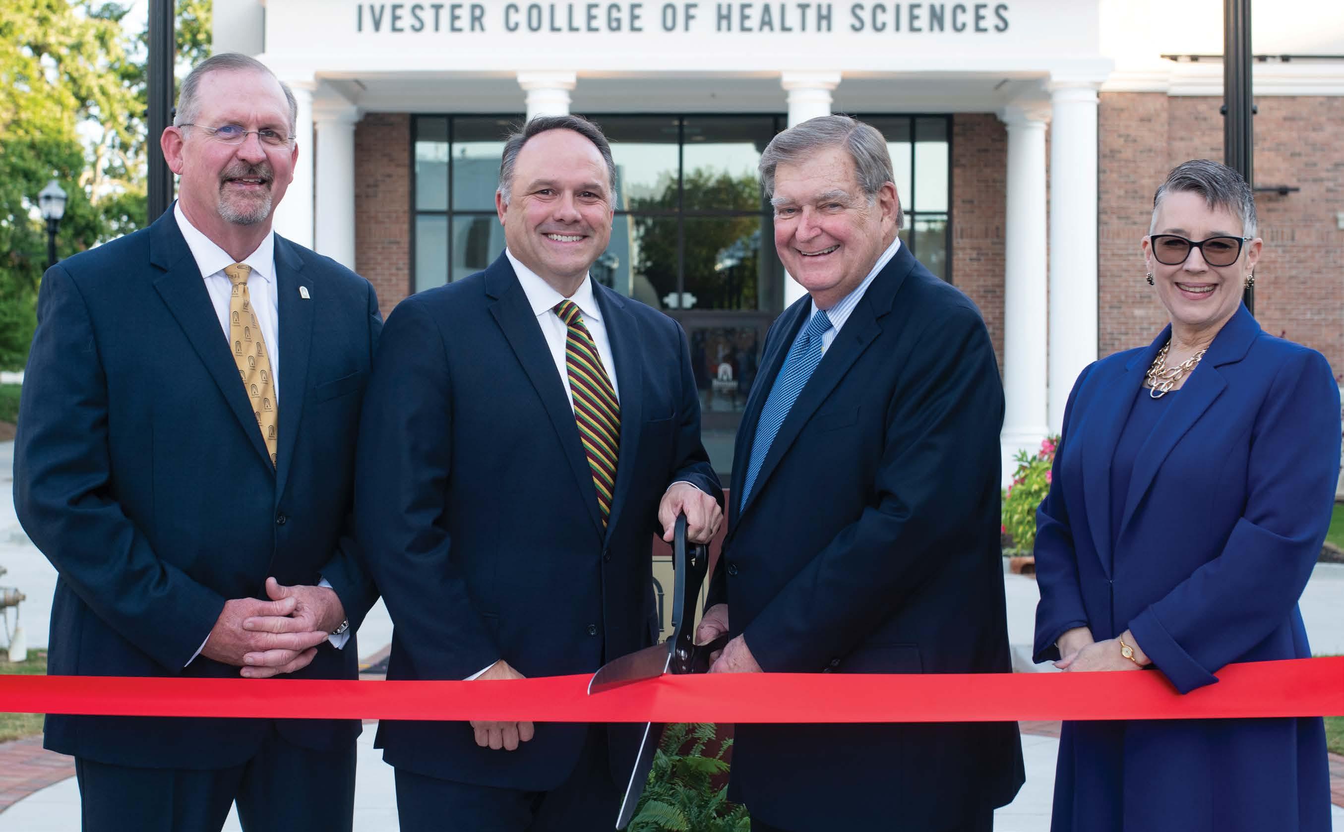 From left: Brenau Board of Trustees Chair Mike Smith, Gainesville Mayor Sam Couvillon, Trustee Doug Ivester and Brenau President Anne Skleder at the ribbon-cutting ceremony for Renaissance Park.