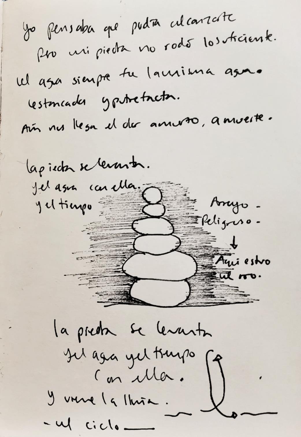 He logrado establecer puentes de comunicación sensible que resuenan en mi cuerpo y en mis emociones. Estos caminos invisibles los he construido a partir de mi propia experiencia; de la observación constante durante mis caminatas por las orillas de los ríos, el dibujo en sitio, la activación de mis recuerdos, pensar en el agua que corre y la memoria de sus arroyos.