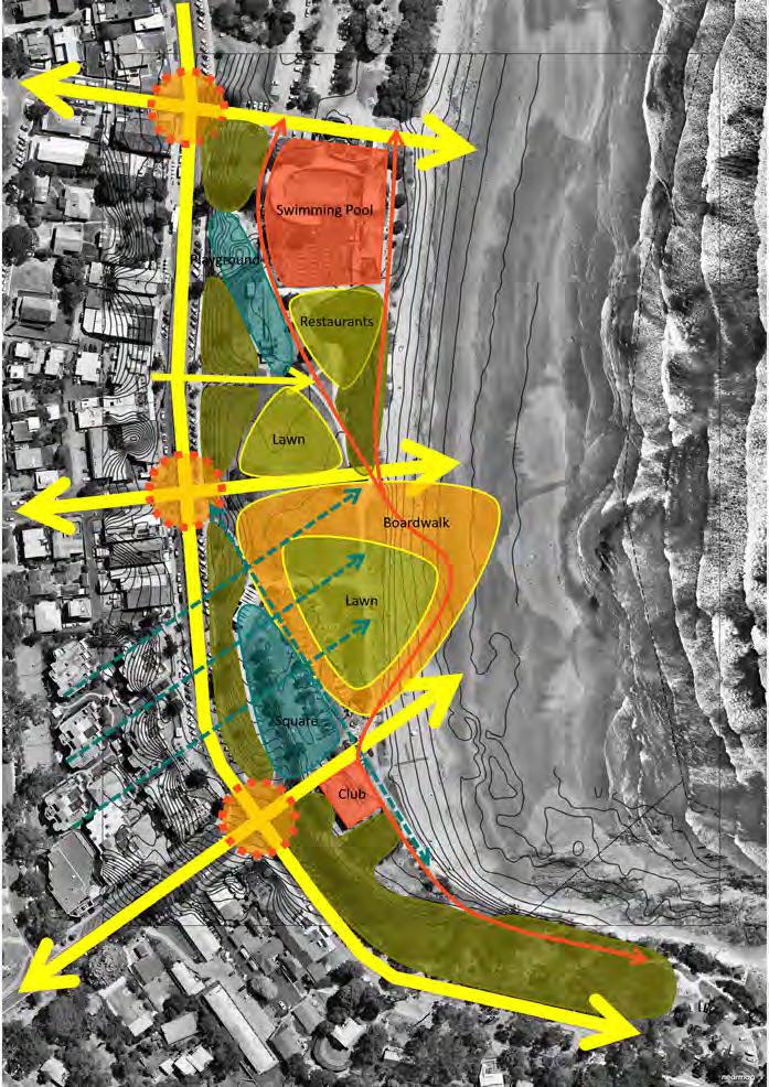 商业区附近设有一个三角形的俯瞰平台,下方是面向大海的活跃零 售空间。停车场被移至地下,其上可用作屋顶花园。所有的活动空 间都是沿着垂直于场地附近的城市肌理(包括酒店方向的视线)组 织起来的。