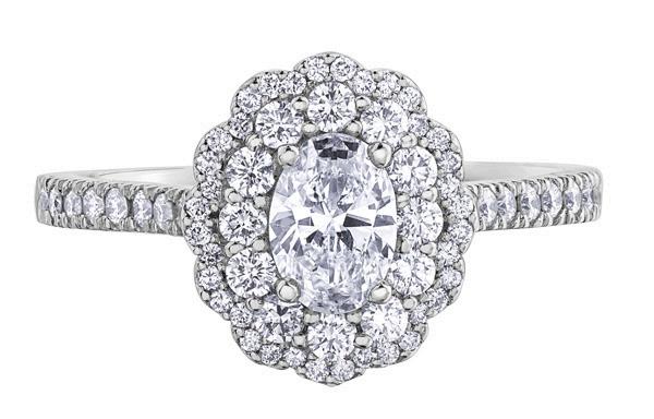 Pairing a brilliant cut diamond and diamond halo, this romantic design from Drakes is rich in vintage appeal.