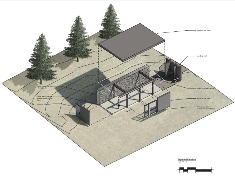 B 1. 5 A 1 2 85 " 87 " 98 " 64 " 1' - 0" 0' - 3" 3 30 " cab n stee co umn exter or wal sorefront g az ng and frame eas porch west porch 1 98 " west porch Level 1 0' - 0" Level 2 8' - 8" B A Level 3 13' - 8" 3' - 8" 11' - 6" 3' - 10" 19 - 0 5'0" 8'8" 13 '8 " roof wi h stee framing c p retaining wal grade line perimeter steel beam 1 insulated storefront glazinf c i p slab on grade building floor plan building section scale: 1/4 =1 -0 scale: 1/4" 1 -0" 0' 2' 4' 8' 16'
