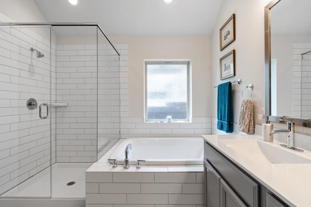 • Spacious owner’s retreat with bay window, large walk-in closet, and modern farmhouse, spa-like ensuite bathroom