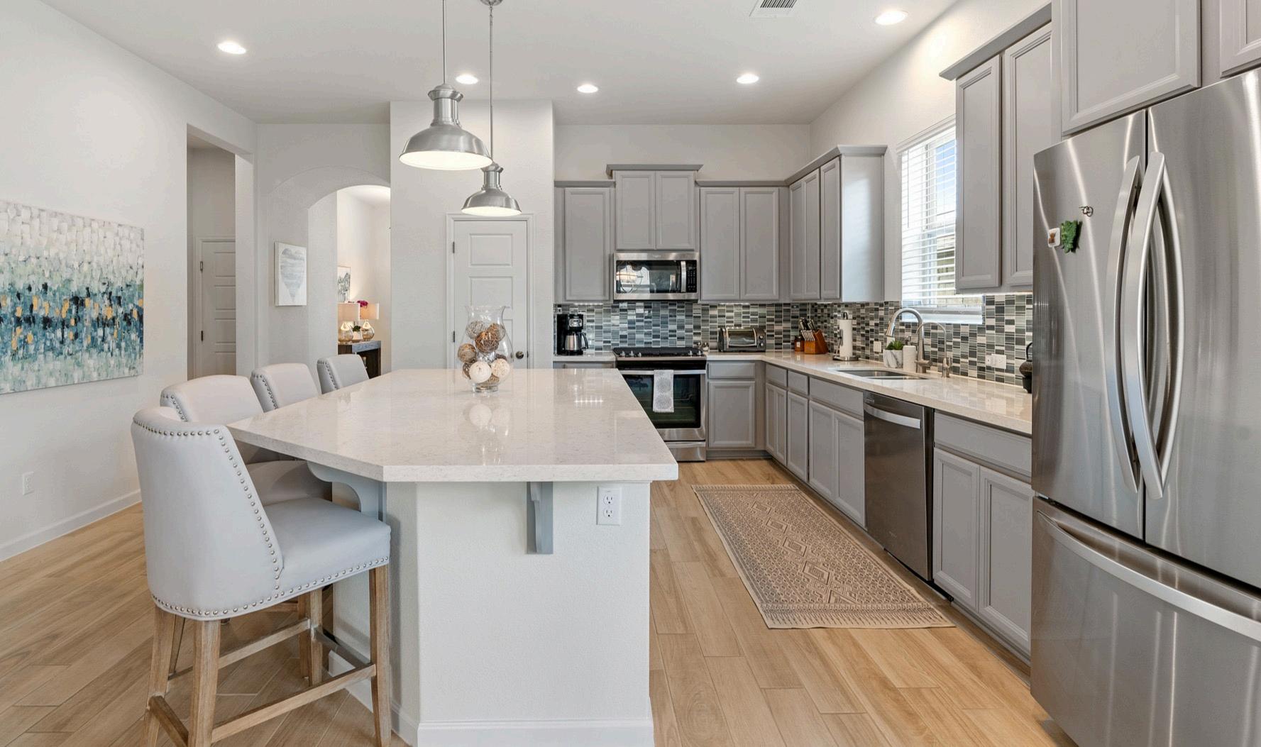 Kitchen Main Breakfast Area, Breakfast Bar, Center Island, Counter-Quartz, Open to Family Room, Recessed Lighting