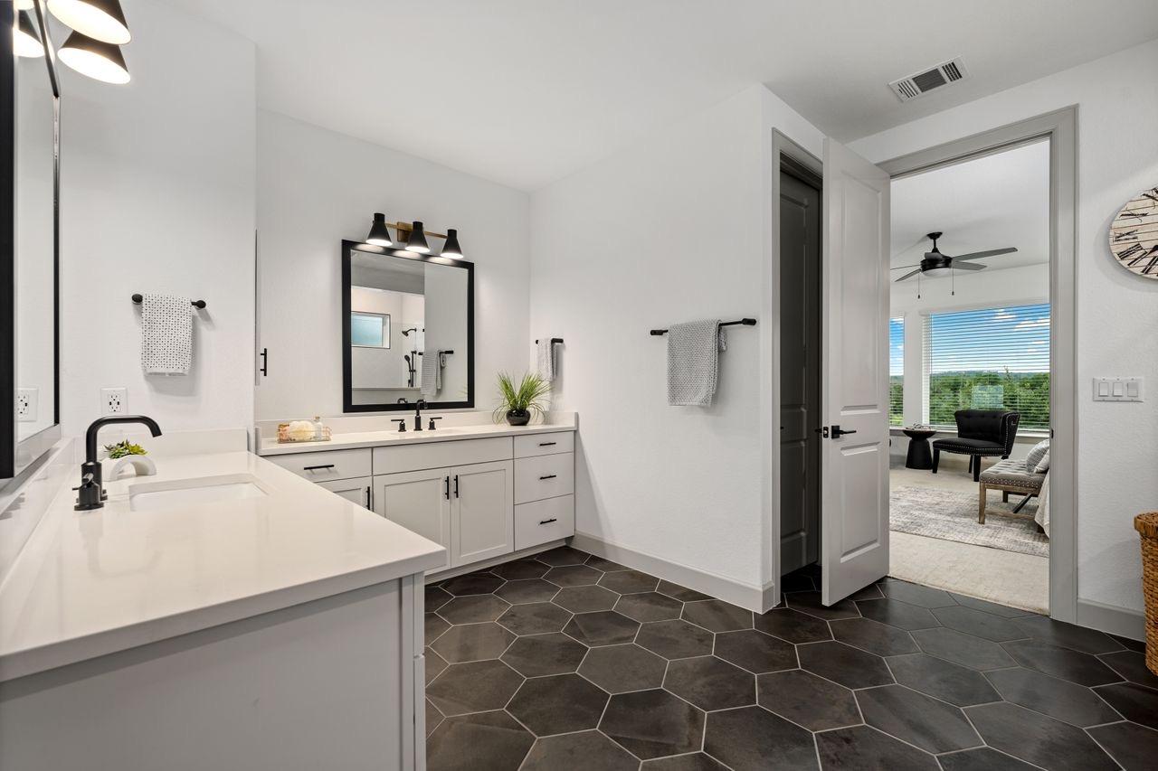 • Extended owner’s retreat and spacious ensuite bathroom with super shower, double shower heads, art deco tile + extra storage