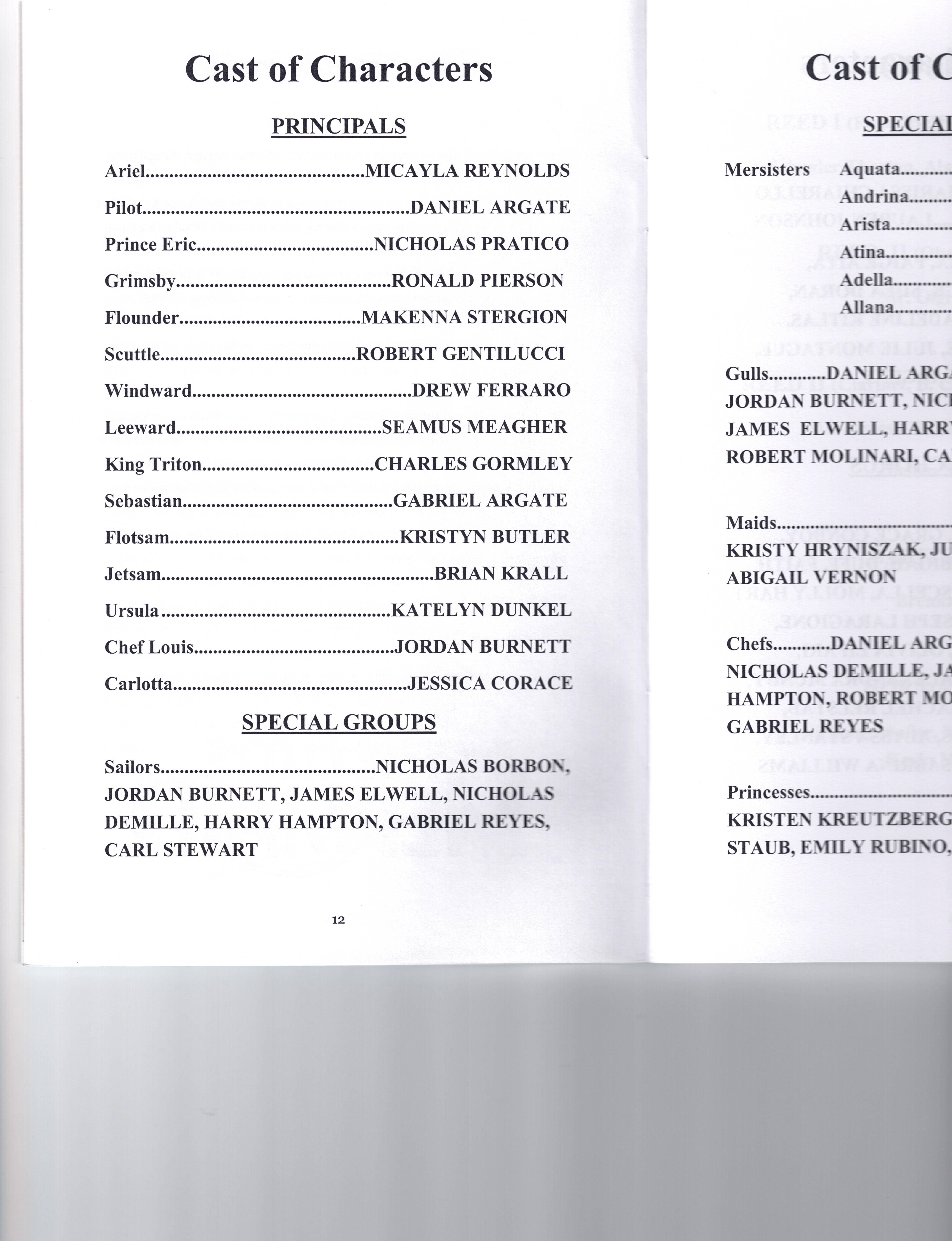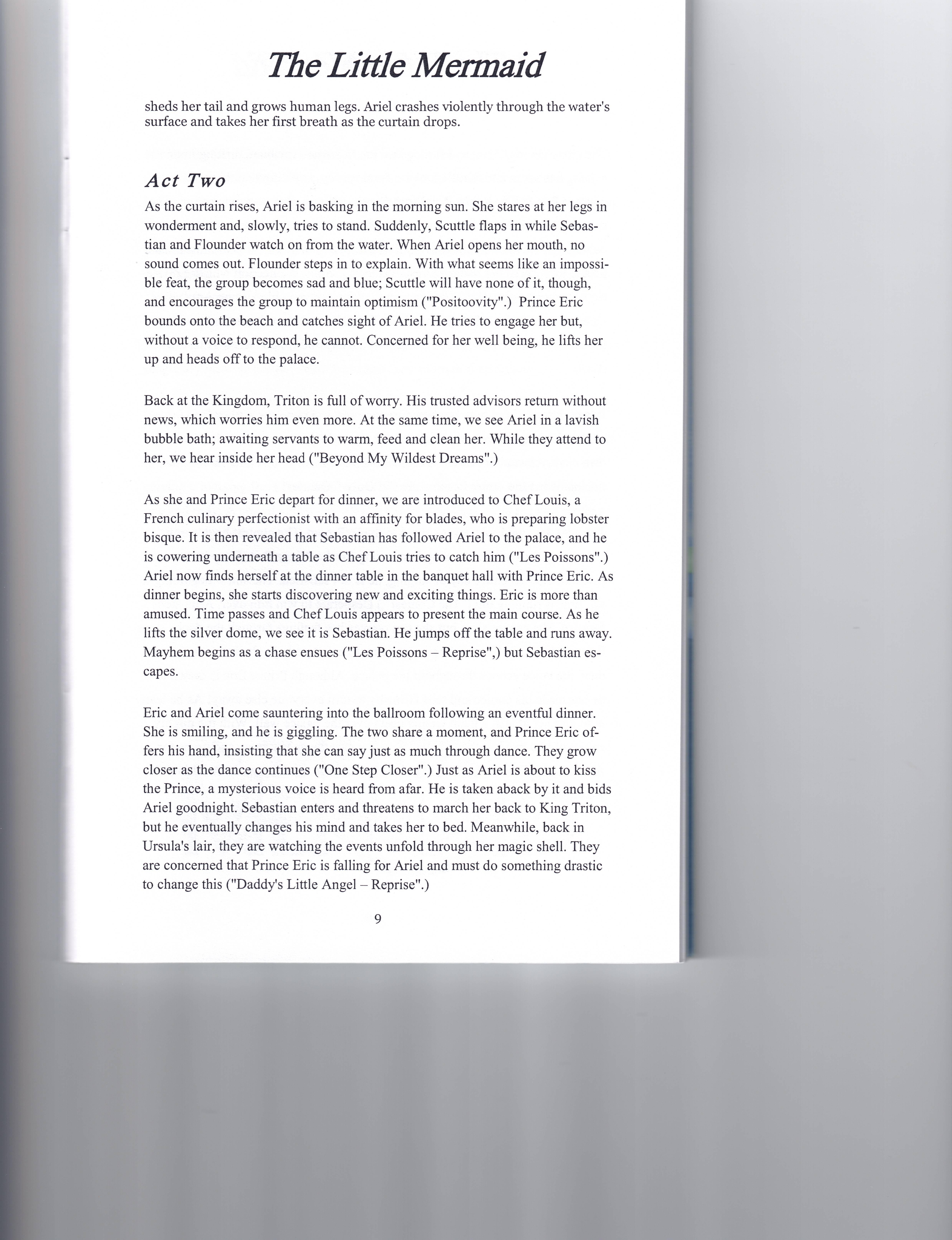 Meanwhile,beneaththeopenwater,Arielsitsandplucksaflower.Sebastian appearsandvoiceshisconcernfortheyounggirl.Sheremindshimthatherlife undertheseafeelsincomplete,butheinterjects:thehumanworldisamessbut theseaworldishertruehome("UndertheSea".)AsSebastianrejoiceswiththe otherunderwatercreatures,Arielsneaksaway.KingTritonthenbargesinwith hisotherdaughters,whohavetoldhimofAriel'sloveforahuman.TritondemandsthatSebastiantakehimtoher.Backatthegrotto,Arielisspeakingtothe heroicbust.Assheconfidesinit,weheararumbleasKingTritonrushesin.He isfurious,demandingtoknowthetruthofherinteractionwithahuman.Ariel beginstoarguewithherfather, whichonlymakeshimmoreenraged,usinghis tridenttoblastandobliteratethebust.Thebustcrumblesintoamillionpieces and,asTritonswimsaway,ArielsearchesforthespyglassshetookfromPrince Eric;itisstillintact.SheclingsontoitasSebastianunsuccessfullytriestoreason withher("IfOnly-Ariel'sLament".)AsSebastiandeparts,FlotsamandJetsam slitheroutfromthedarkness;Arielrealizesthatsheisnolongeralone.Theeels pretendtocomfortthechildandpresentasolutiononbehalfofherAuntUrsula. Arielisbothscaredandskepticalbut,whentheevilduosuggestaspellthatcould tumherintoahumanandgetheroutoftheKingdom,sherelentsandagreesto gowiththem("SweetChild".)AssheheadsintoUrsula'slair,Flounderarrives justintimetoseeherdisappearintothedeepestvoidsoftheseafloor.