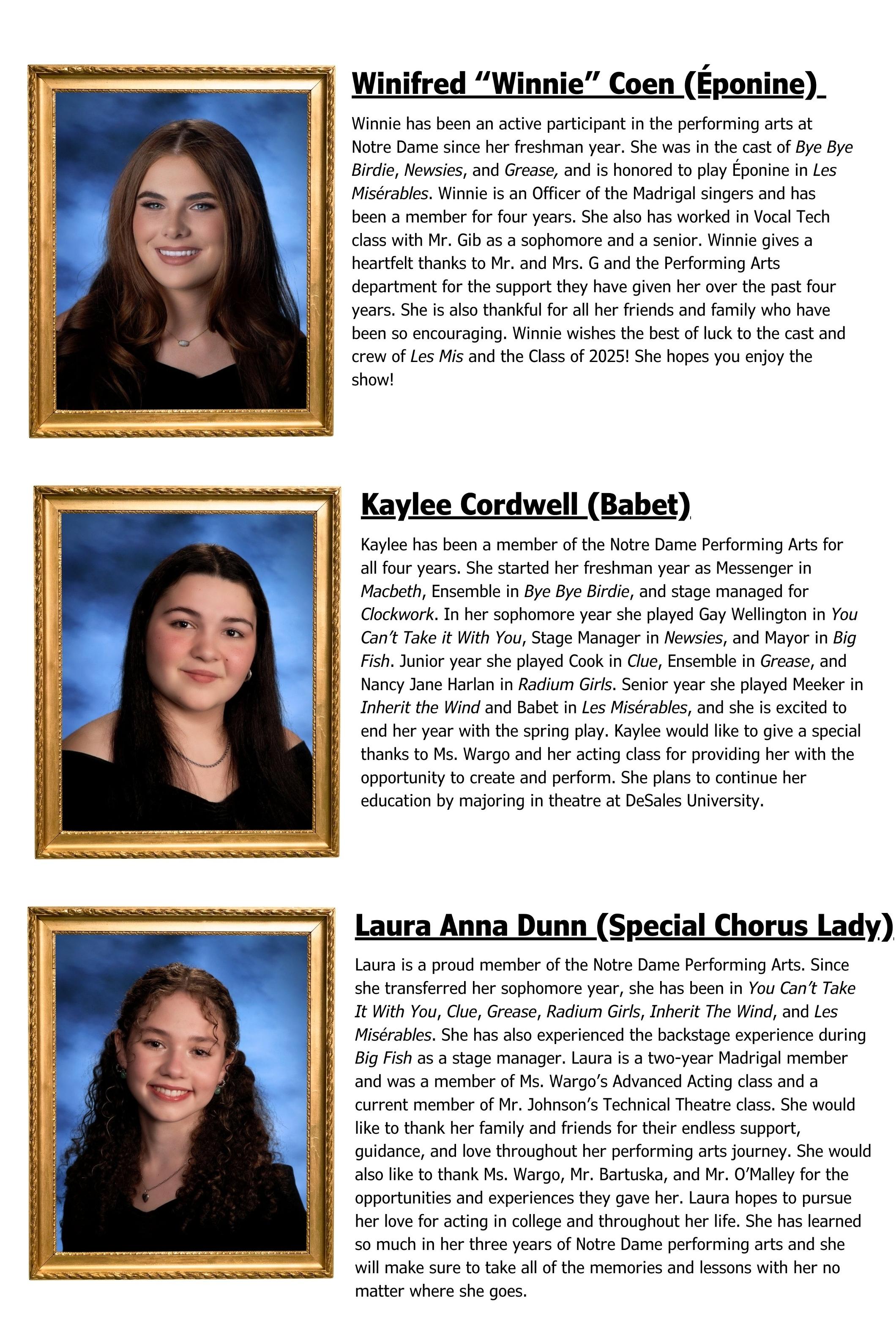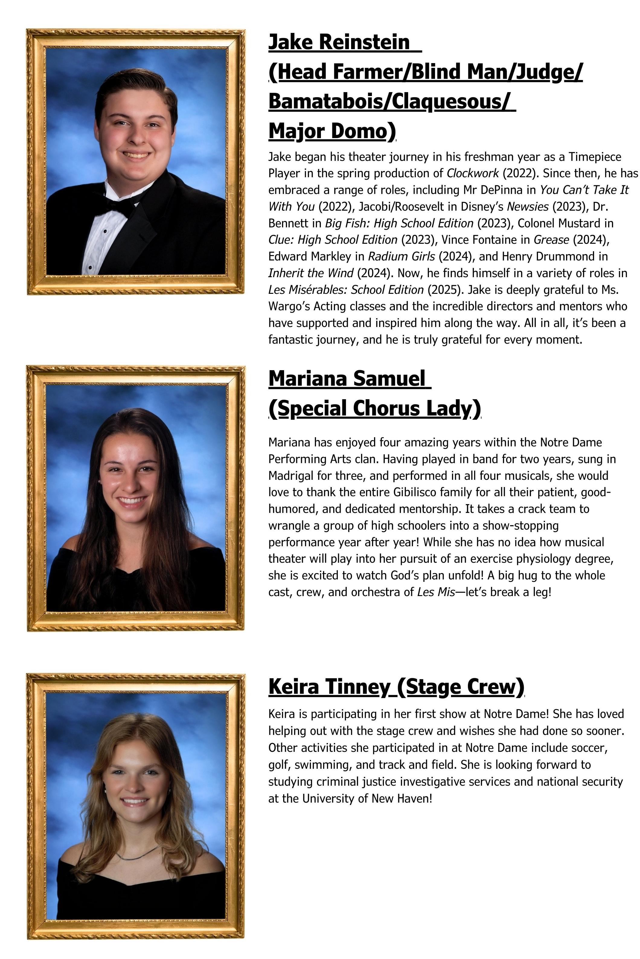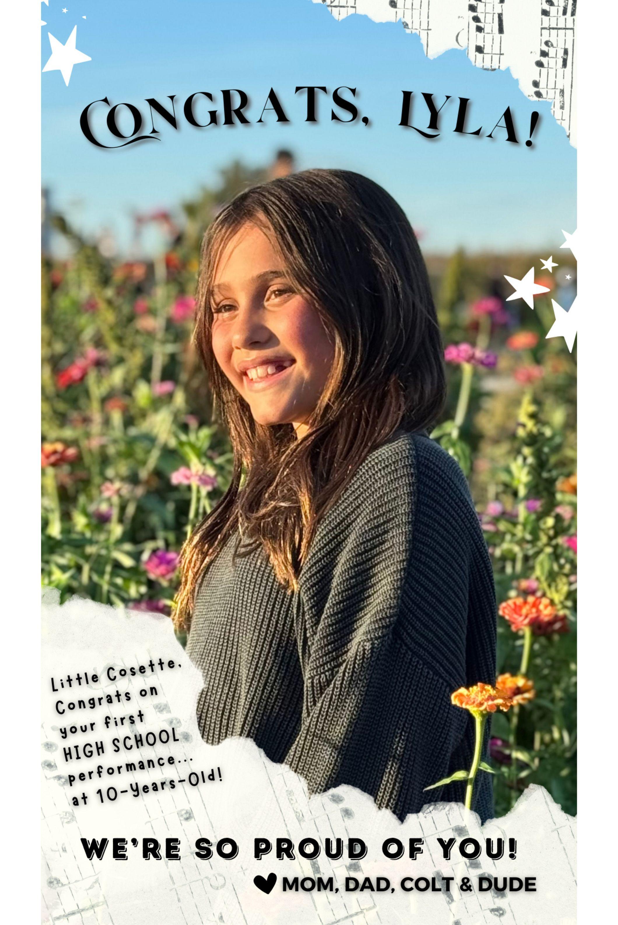 Olivia D: Congrats on your first STAR role as Cosette. So proud of your hard work & so grateful I got to work with you in my last show. I am so excited to see you shine in your coming years at ND. Love you, Liv! - Nick T