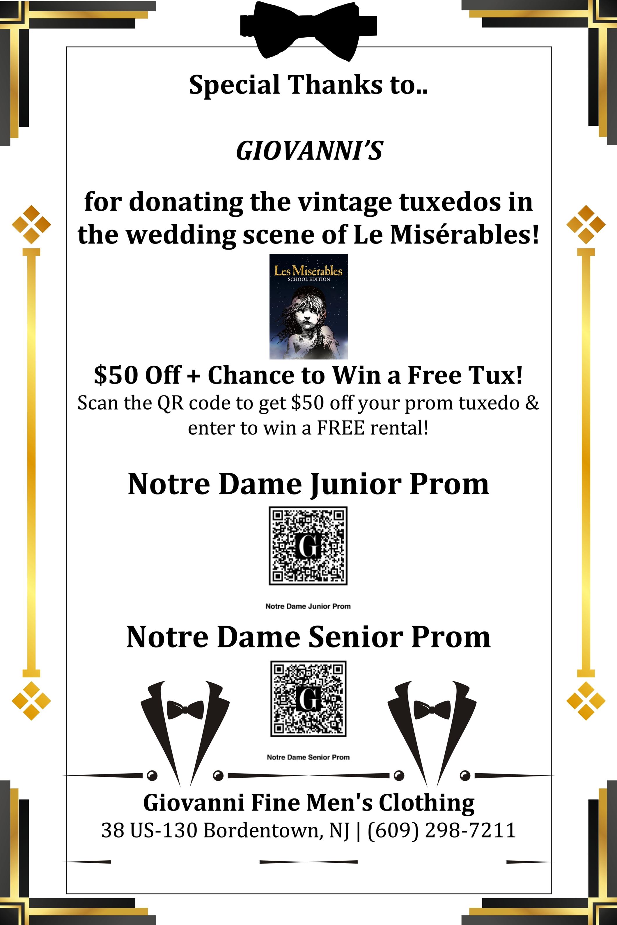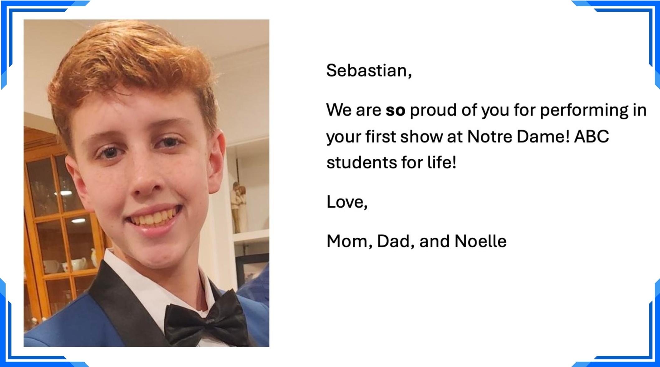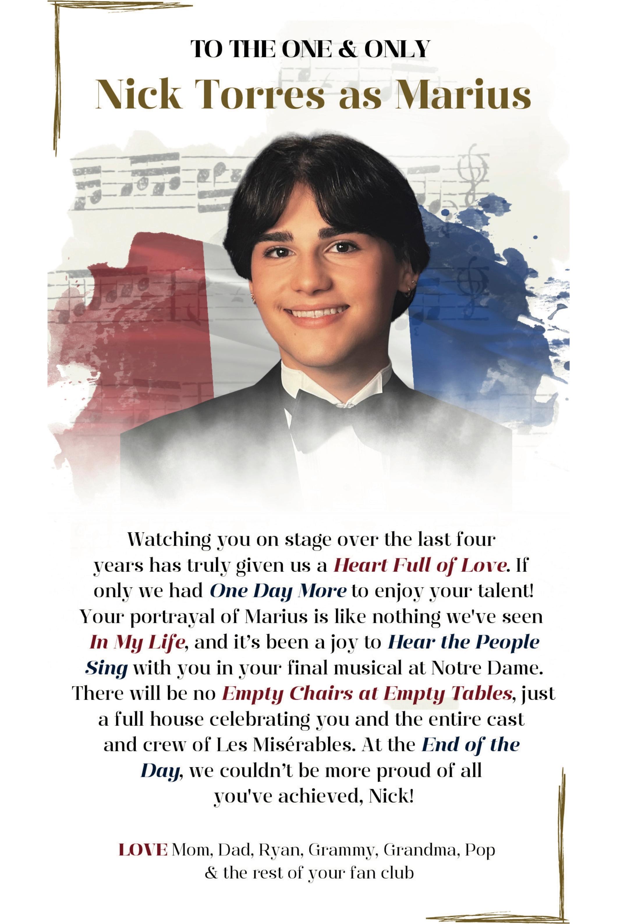 Nick T: Break legs at your last show at NDHS! We know you will make an amazing Marius. We are both so proud of you. Love you, Ryan & Jill