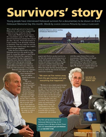 Survivors’ story Young people have interviewed Holocaust survivors for a documentary to be shown on Brent Holocaust Memorial Day this month. Words by SHARON DONOVAN Pictures by ISABELLE PLASSCHAERT. When a Jewish girl arrived in AuschwitzBirkenau she could not have imagined that a talent for music would save her life. Anita Lasker Wallfisch was deported to the concentration camp in 1943. “When I arrived I mentioned in passing that I played the cello,” she said. “From that moment on I was a member of the all-female orchestra in Auschwitz.That was a ticket for survival. As long as they wanted music they couldn’t put us in the gas chambers.” Today she lives in Brent and is one of five Holocaust survivors who speak in a film made by young film-makers to mark Brent Holocaust Memorial Day organised by Brent Council.The day is being held to remember more than six million Jews and millions from other groups including gypsies, gays and lesbians and disabled people killed in the Holocaust.This year marks the 65th anniversary of AuschwitzBirkenau’s liberation on 27 January 1945, where the Nazis alone murdered more than one million people from across Europe. “We never thought we’d get out of Auschwitz,” said Anita. “We were sat five metres away from the gas chambers and saw everything that happened.” She and the other orchestra members were made to play as people were sent to their deaths in the gas chambers and marched in and out of the camp to work as slaves by the SS