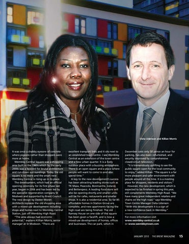 December costs only 50 pence an hour for parking, has also been refurbished, and security improved by comprehensive closed-circuit television. “It is tremendously uplifting to see the public square open for the local community to enjoy,” added Killian. “The square is a far more pleasant and safer environment with people around all the time. It is a meeting place for shoppers, residents and visitors.” However, the new development, which is expected to be finished in spring this year, still complements Wembley High Road. “We have many great independent retailers and chains on the high road,” says Wembley Town Centre Manager Osita Udenson. “With this development it is a sign of a new confidence back in Wembley.” For more information visit www.wembley-central.co.uk or www.wembleytown.com