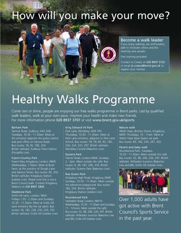 Healthy Walks Programme Come rain or shine, people are enjoying our free walks programme in Brent parks. Led by qualified walk leaders, walk at your own pace, improve your health and make new friends. For more information phone 020 8937 3707 or visit www.brent.gov.uk/sports Barham Park Harrow Road, Sudbury, HA0 2HB. Tuesdays, 10.30 - 11.30am. Meet at the entrance opposite the police station and post office on Harrow Road. Bus routes: 18, 92, 182, 204. British rail/tube: Sudbury Town Station (Piccadilly Line). Fryent Country Park Fryent Way, Kingsbury, London, NW9. Wednesdays, 1.55pm. Meet at Bush Farm, at the junction of Slough Lane and Salmon Street. Bus routes: 83, 302. British rail/tube: Kingsbury Station (Jubilee Line). Please note this is not a Brent Council walk. Contact Kingsbury Walkers on 020 8907 2836. Gladstone Park Dollis Hill Lane, London, NW2. Fridays 1.30 - 2.30pm and Sundays, 10.30 - 11.30am. Meet at Dollis Hill Lane entrance (by the car park). Bus routes: 16, 182, 226, 232, 245, 332. British rail/tube: Dollis Hill (Jubilee Line).