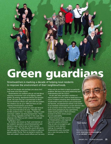 where and we are there to report on particular problems. We have a very good relationship and understanding with the council.” He also asks other association members to report problems to him, which he feeds back to the council. Problems solved by other Streetwatchers include broken street furniture such as lamp-posts and benches, and abandoned vehicles in the streets. It was Harlesden Streetwatcher Lorraine Skinner’s idea to set up Green Zones while others have helped tackle excess packaging by big supermarkets, visited recycling plants in Brent and been involved in the Echo Action project around sustainability. Brent Council provides training for Streetwatchers, and organises trips and a yearly conference. ‘Hush’ Kothari They are also encouraged to get involved in some decision making, for example, the Streetwatchers were consulted For more on Streetwatchers, over a new tree policy for the email streetwatchers@brent.gov.uk borough. or call 020 8937 5050.