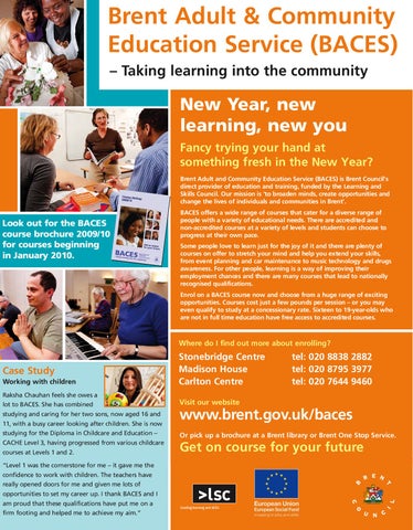 New Year, new learning, new you Fancy trying your hand at something fresh in the New Year? Brent Adult and Community Education Service (BACES) is Brent Council's direct provider of education and training, funded by the Learning and Skills Council. Our mission is ‘to broaden minds, create opportunities and change the lives of individuals and communities in Brent’.