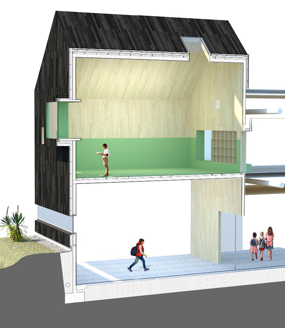 above nearby homes were studied as a precedent in the organizing strategy for the school classrooms and common areas