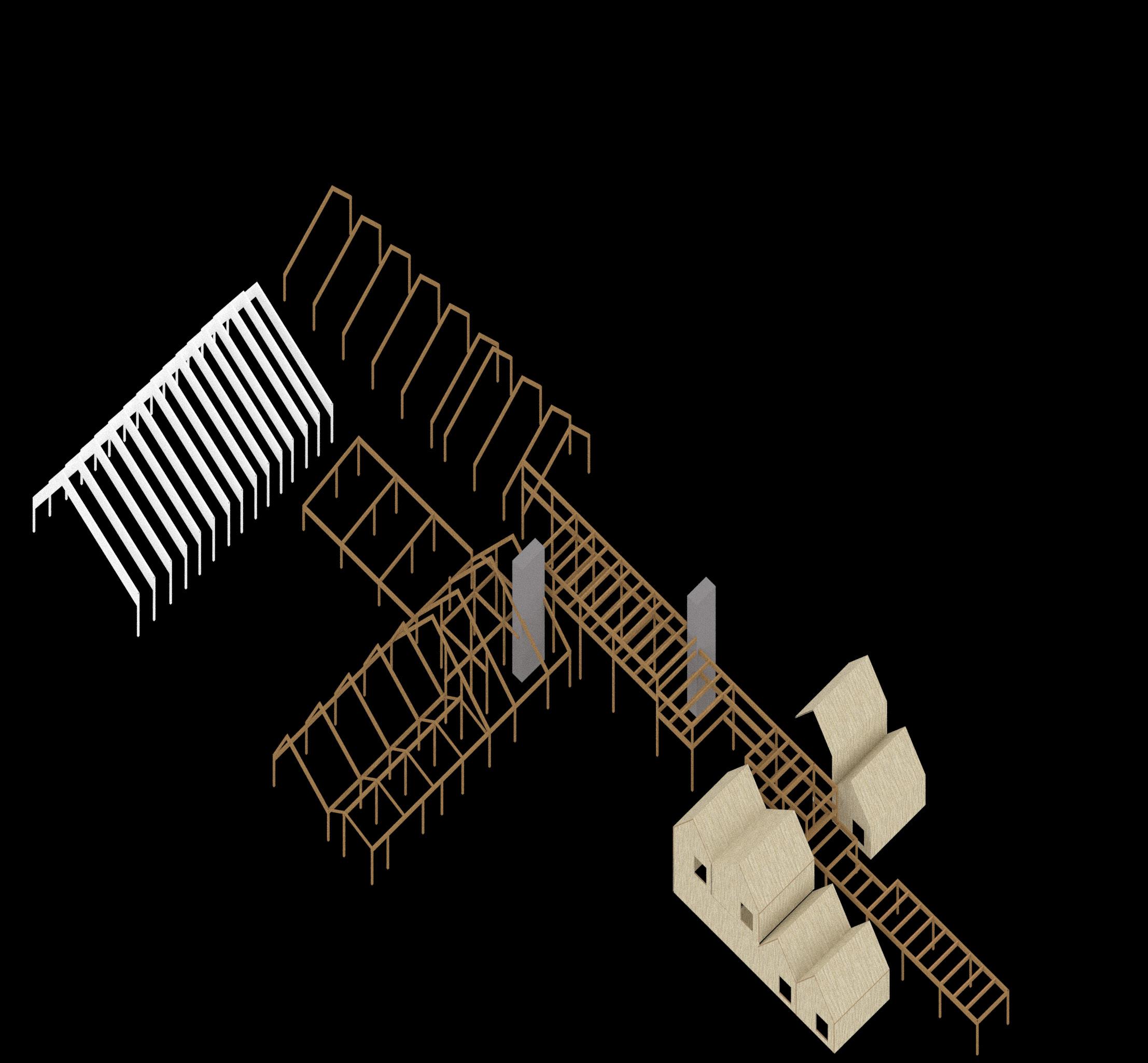 above the concept of the pavilion became about protecting, connecting, and reflecting. this developed into using a gable roof and reflective butterfly ceiling below to understand how to build the pavilion, physical and digital models were created alongside meeting with consultants who helped bring the concept into the details.