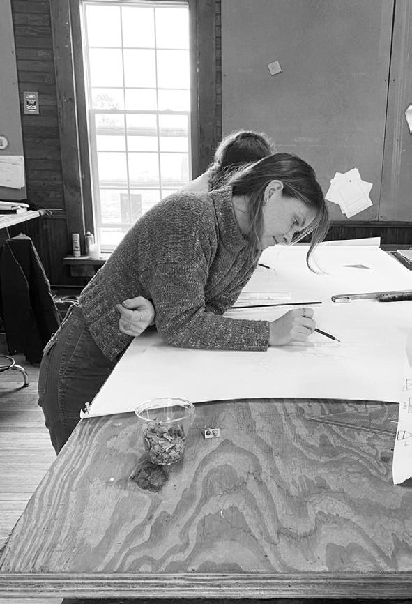 As part of a seminar at the Rural Studio, the team designing and building Ophelia’s home also created a quilt. The idea was to create a piece that was inspired by Ophelia and the land she resides on while learning about the local culture of quilted storytelling. The process included finding recycled fabrics, visiting Gee’s Bend Quilting Col-