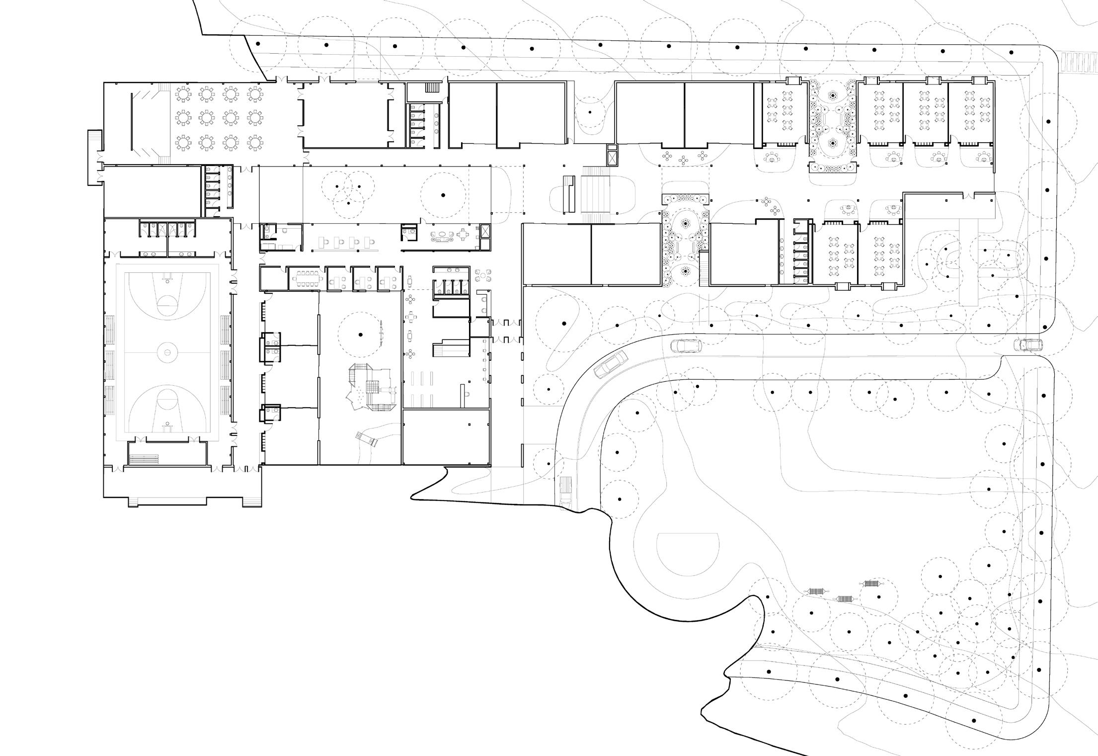 left the ground floor plan explains the organization of classrooms and larger gathering spaces along interior streets