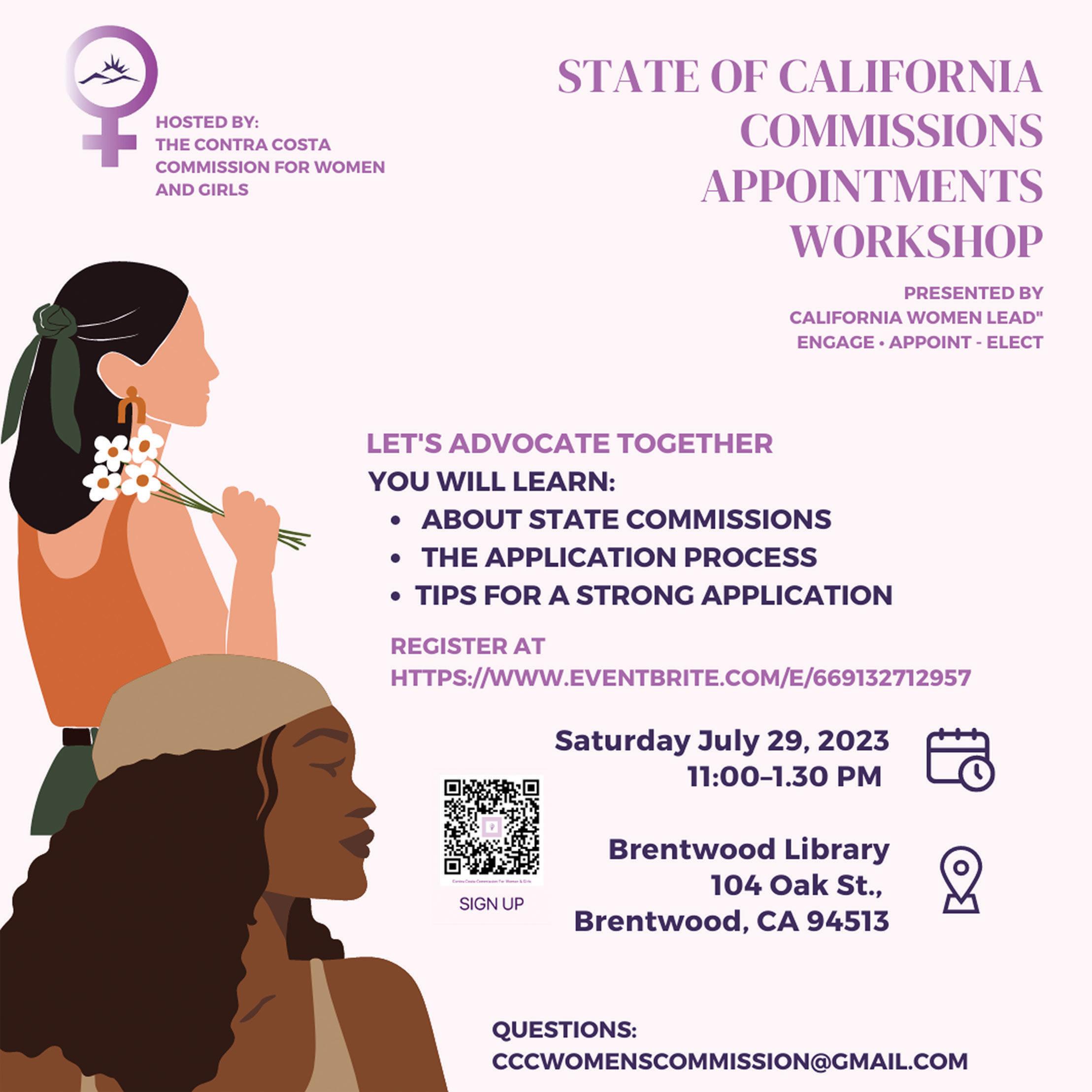 The Contra Costa Commission for Women and Girls and the California Women Lead are hosting a State of California Commissions Appointments Workshop on July 29 at 11 a.m. to 1:30 p.m. Brentwood Library at 104 Oak St. in Brentwood.