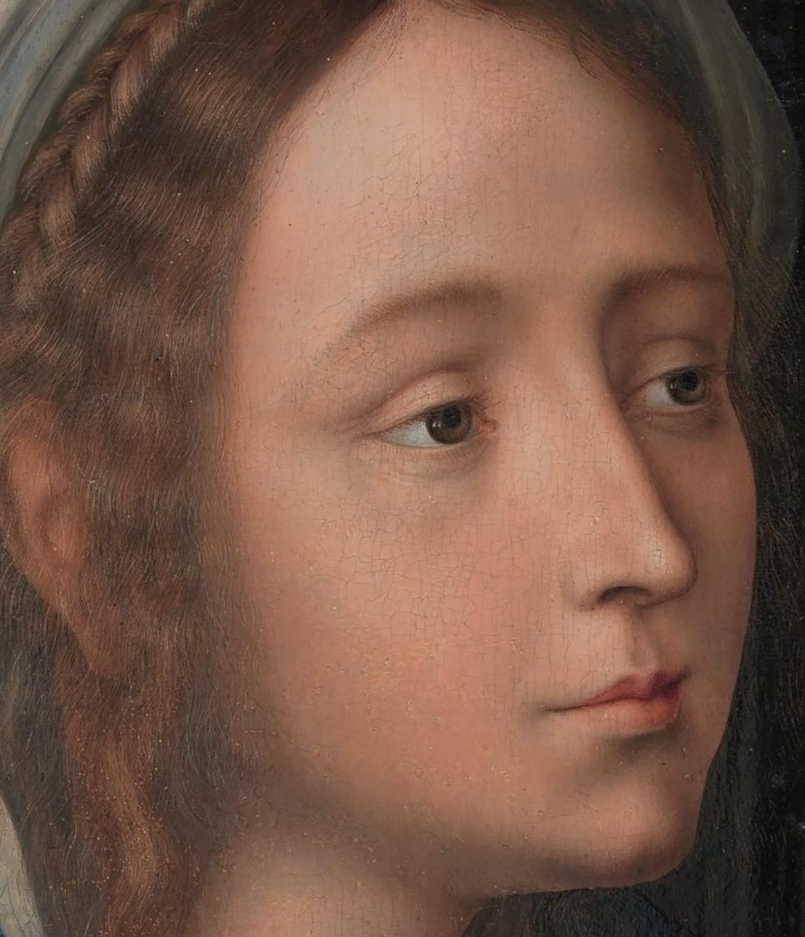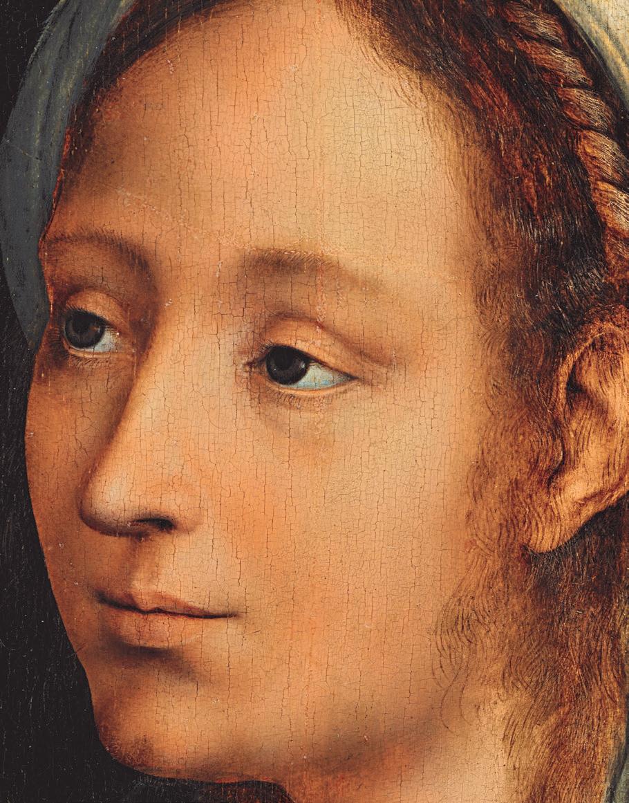 That the two paintings show differences in the underdrawing technique and in the application of the paint is incontrovertible. The Christ, thanks to a methodical use of the glazes and a subtle transition from dark to light, is more consistent with the late style of Quinten. The comparison with a Virgin at Prayer, auctioned by Lempertz in 2020 (fig. 1 4)21, of remarkable quality and reasonably attributable to Quinten, helps us to better evaluate the Madrid Virgin within Quinten’s production. The Madrid version, in fact, shifts to a kind of softening and puffiness of the shape of the face that seems to presage a