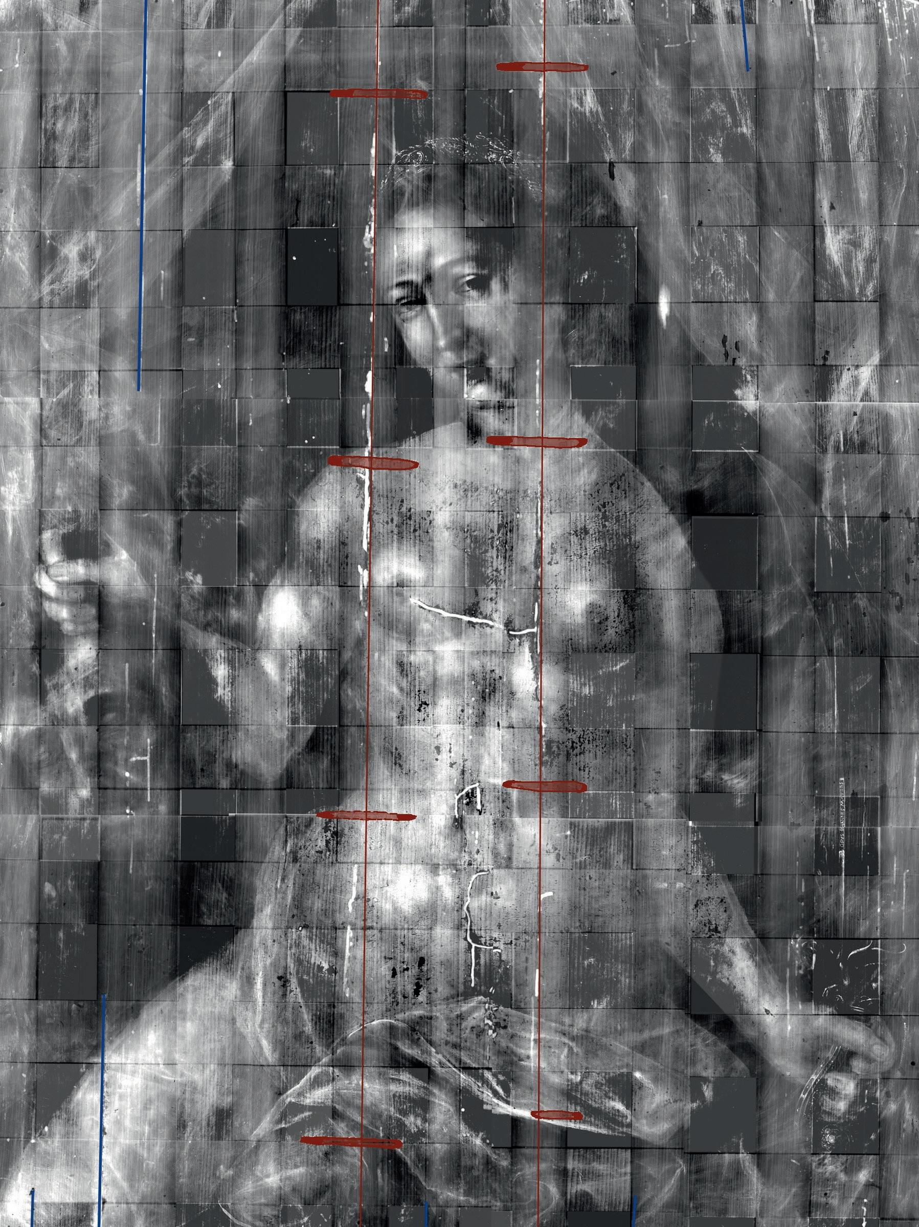 Assembly was generally regular, made of equally-sized boards, glued together with the grain running horizontally or vertically, depending on the format of the painting. As was usual, the joins were reinforced by adding wooden pins. The X-radiograph of the Boston Judith, which has three vertical boards with two joins, reveals that each one of the joins was originally held in place with four dowel pins (fig. 5.01).