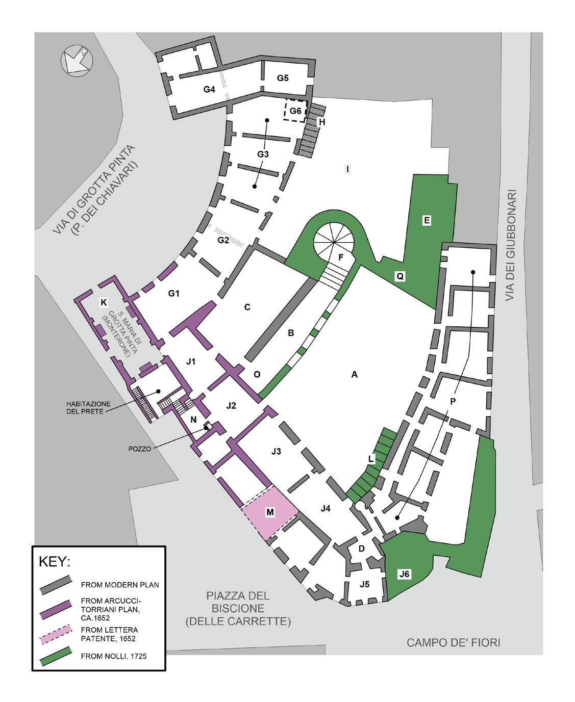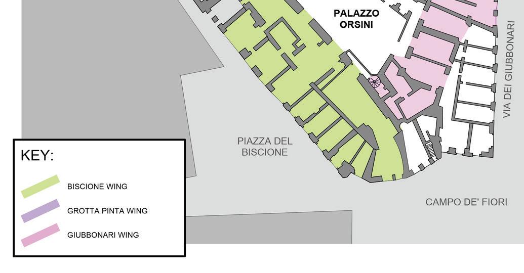 by its own external stairs from the courtyard (L), and its suite of rooms included the newly created space in the old tower (D) and the room in the palazzetto (J5) (now evidently incorporated into the palace), as well as camere on the north side of the wing. A terrace overlooking Campo de’ Fiori gave it an exterior outlet (J6).