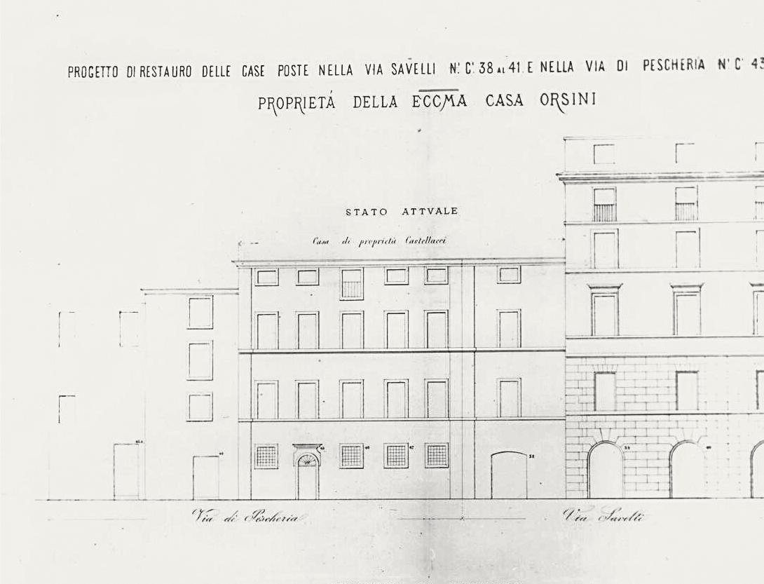 A. Carnevale, project to renovate the houses along Via di Pescheria and Via Savelli (the southern corner block of Palazzo Orsini (former Palazzo Savelli) and the Castellacci house), 1869.