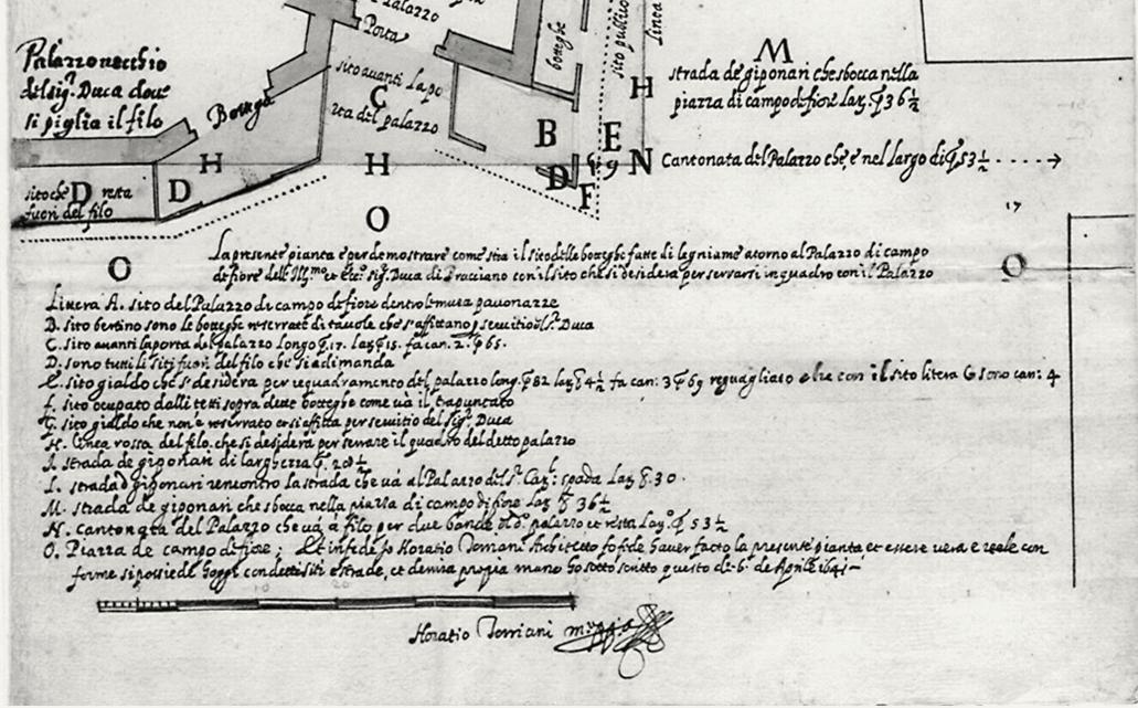 Far more revealing than this already ambitious project, is evidence of an extraordinary plan for the palace. We know of it from a proposal submitted to Paolo Giordano II by a certain Finugio,113 probably identifiable as the architect Girolamo Finugio, a rather distinguished architect connected with the planning of St. Peter’s in the same period.114 The document is actually a cost analysis of Finugio’s proposal, balancing the expense of executing the changes at the palace against the increase in rental earnings these changes would offer. The plan involved carving up the old complex and running a public street through its center. The street would have entered just south of the old tower, cutting through the courtyard and garden, and exiting at the other end of the complex, near S. Barbara.