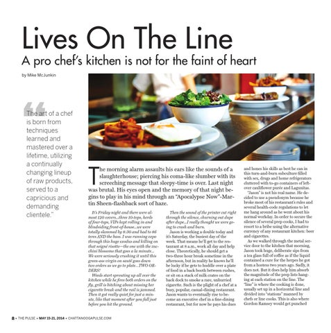 he morning alarm assaults his ears like the sounds of a slaughterhouse; piercing his coma-like slumber with its screeching message that sleepy-time is over. Last night was brutal. His eyes open and the memory of that night begins to play in his mind through an “Apocalypse Now”-Martin Sheen-flashback sort of haze. It’s Friday night and there were almost 120 covers...three 10-tops, herds of four-tops, VIPs kept rolling in and blindsiding front-of-house...we were totally slammed by 8:30 and had to 86 teres AND the bass. I was running expo through this huge exodus and killing on that soigné risotto—the one with the zucchini blossoms that goes a la minute... We were seriously crushing it until this green-ass virgin on sauté goes down two orders as we go to plate…TWO ORDERS! Weeds start sprouting up all over the kitchen while he fires both orders on the fly, grill is bitching about missing her cigarette break and the rail is jammed. Then it got really quiet for just a minute, like that moment after you fall just before you hit the ground.