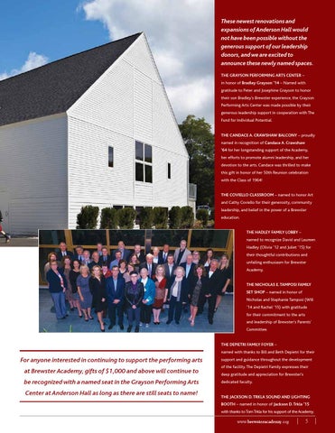 These newest renovations and expansions of Anderson Hall would not have been possible without the generous support of our leadership donors, and we are excited to announce these newly named spaces. The Grayson Performing Arts Center – in honor of Bradley Grayson ’14 – Named with gratitude to Peter and Josephine Grayson to honor their son Bradley’s Brewster experience, the Grayson Performing Arts Center was made possible by their generous leadership support in cooperation with The Fund for Individual Potential. The Candace A. Crawshaw Balcony – proudly named in recognition of Candace A. Crawshaw ’64 for her longstanding support of the Academy, her efforts to promote alumni leadership, and her devotion to the arts. Candace was thrilled to make this gift in honor of her 50th Reunion celebration with the Class of 1964! The Coviello Classroom – named to honor Art and Cathy Coviello for their generosity, community leadership, and belief in the power of a Brewster education. The Hadley Family Lobby – named to recognize David and Laureen Hadley (Olivia ’12 and Juliet ’15) for their thoughtful contributions and unfailing enthusiasm for Brewster Academy. The Nicholas E. Tamposi Family Set Shop – named in honor of Nicholas and Stephanie Tamposi (Will ’14 and Rachel ’15) with gratitude for their commitment to the arts and leadership of Brewster’s Parents’ Committee. The Depietri Family Foyer – named with thanks to Bill and Beth Depietri for their
