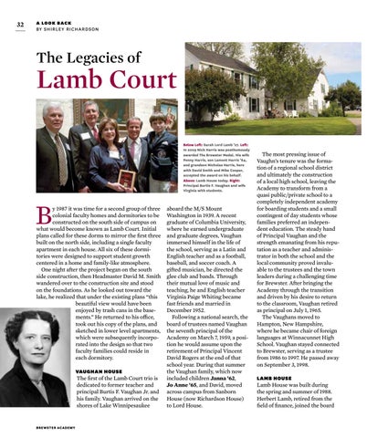 Lamb Court Below Left: Sarah Lord Lamb ’27. Left: In 2009 Nick Harris was posthumously awarded The Brewster Medal. His wife Penny Harris, son Lamont Harris ’84, and grandson Nicholas Harris, here with David Smith and Mike Cooper, accepted the award on his behalf. Above: Lamb House today. Right: Principal Burtis F. Vaughan and wife Virginia with students.