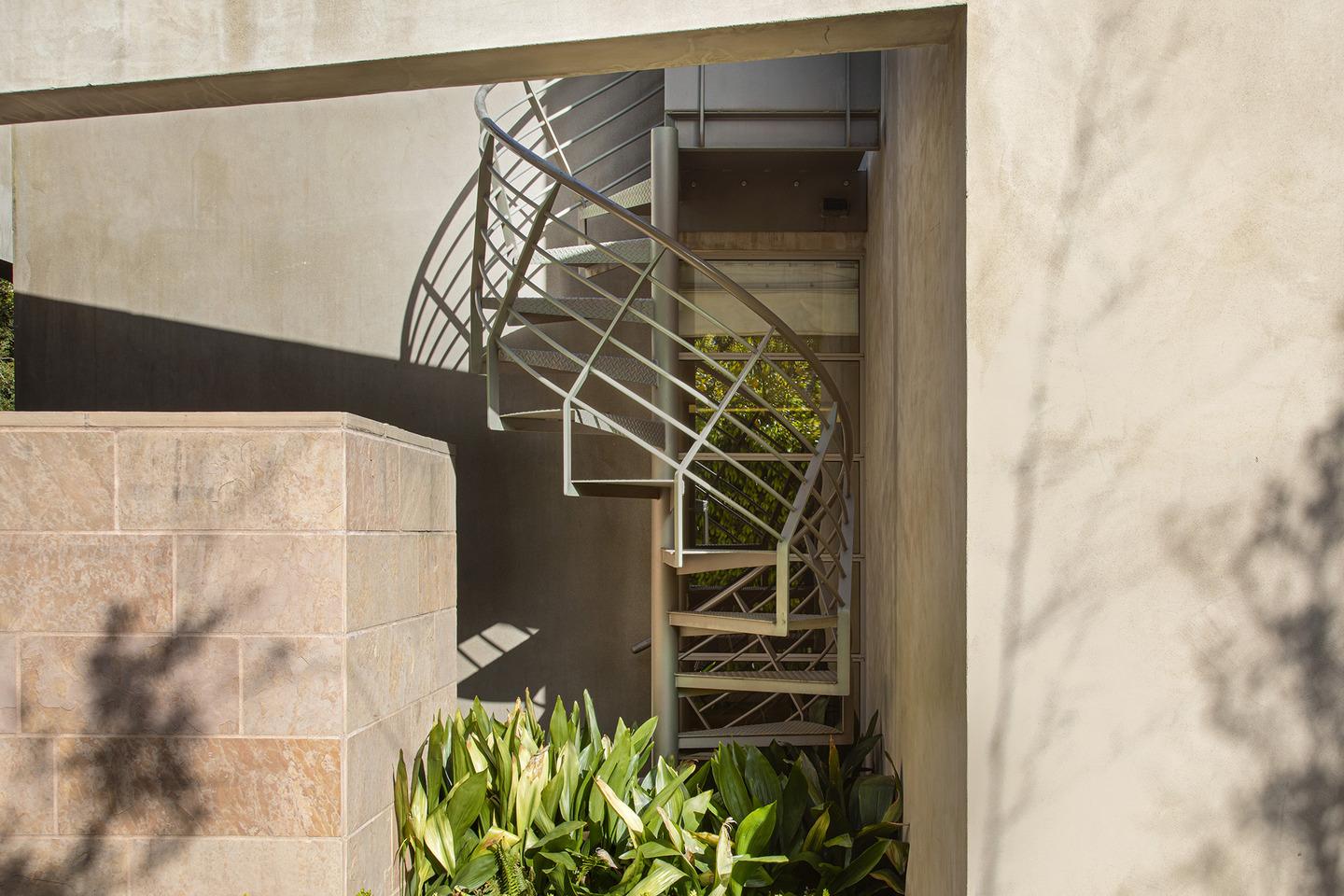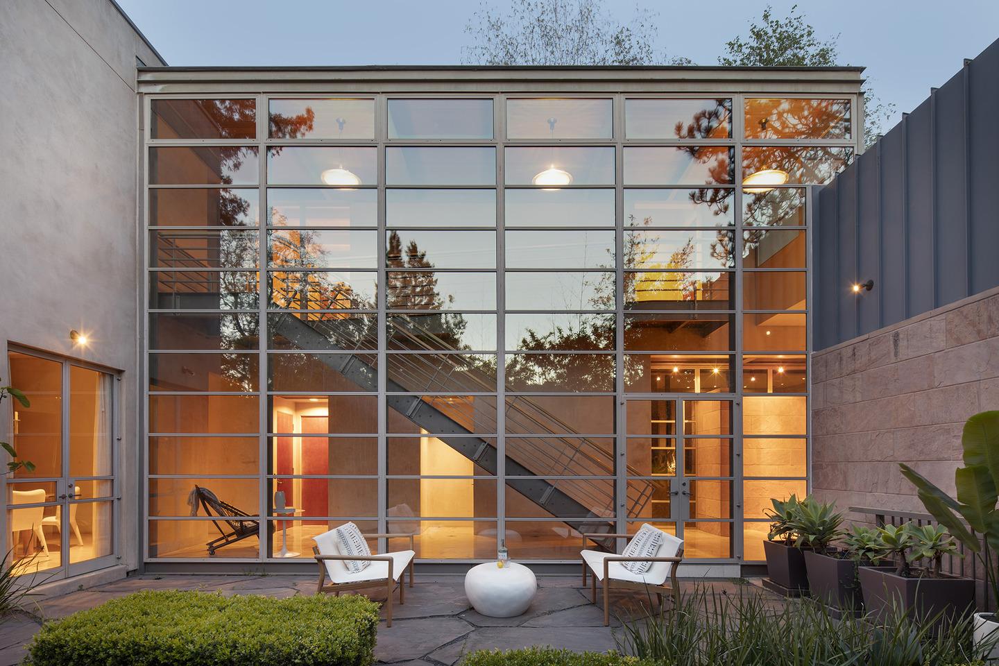 Two-story wall of steel-framed glass serves as a stunning backdrop to the floating steel & maple staircase