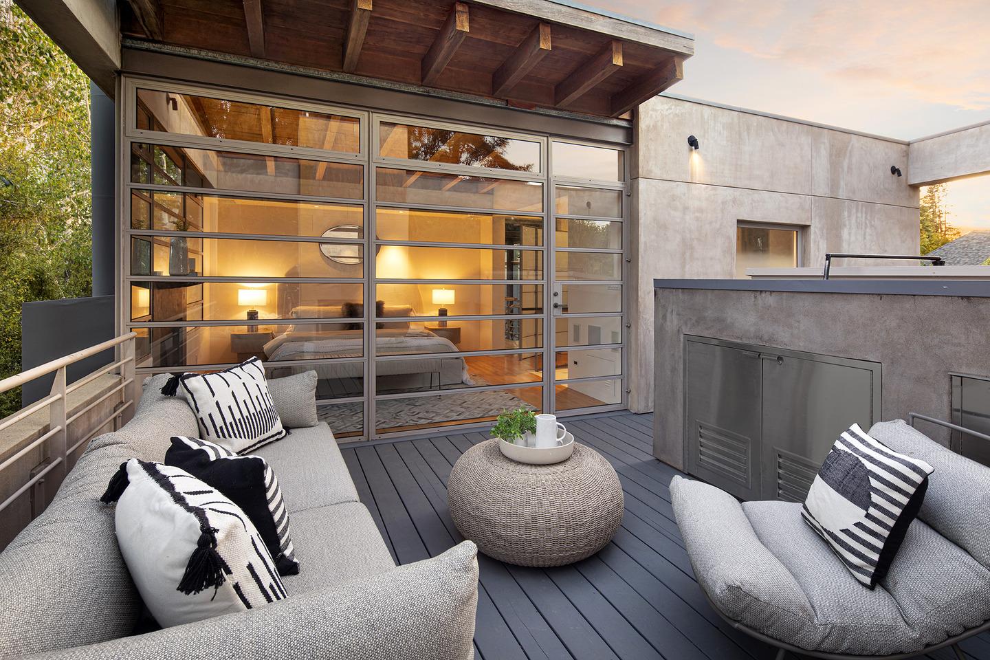 Primary Suite with wood-paneled ceiling and steel fireplace plus walls of windows and door to the lovely outdoor terrace with fireplace and spiral staircase to the pool and spa
