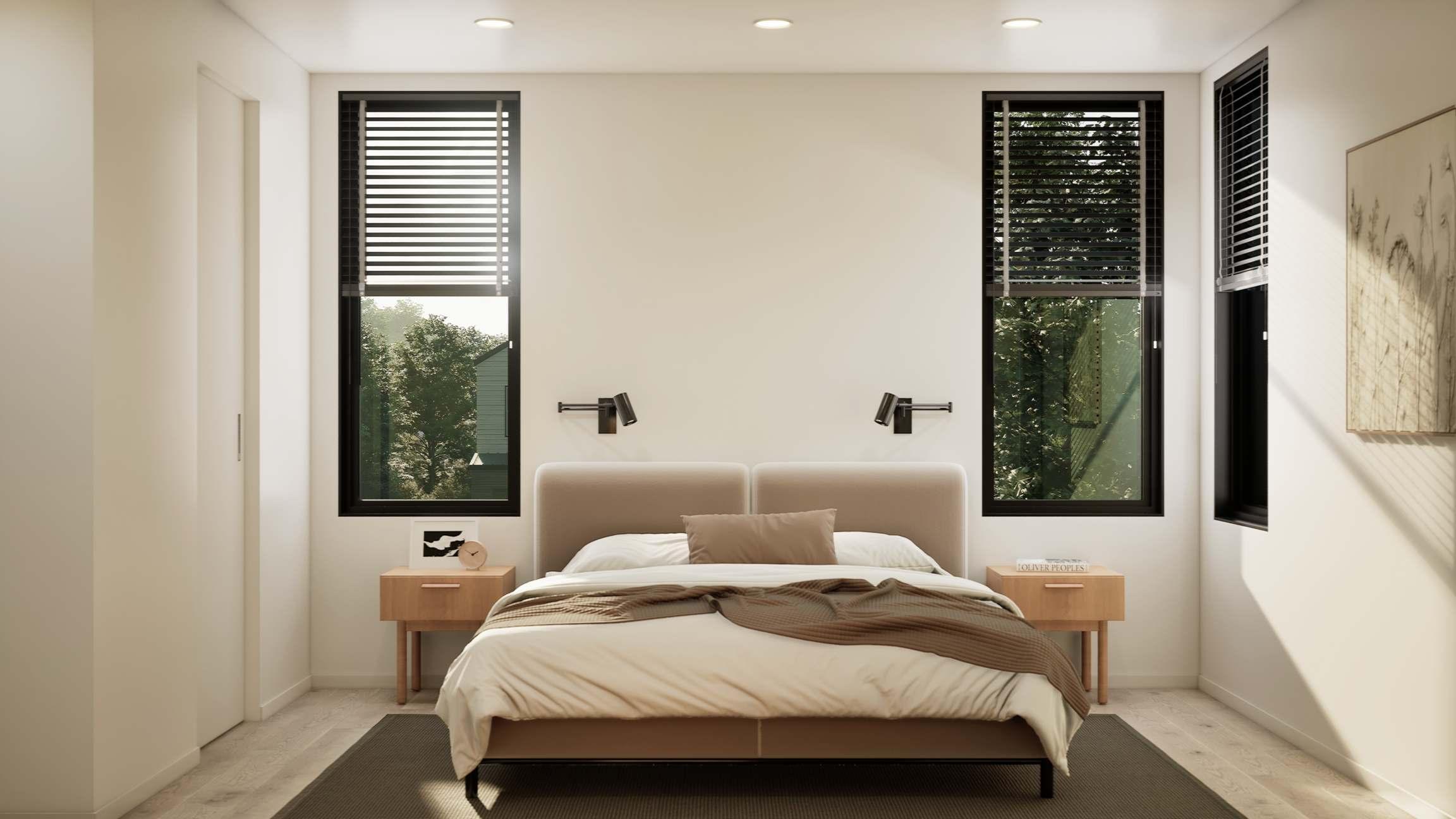 Exposed steel beams, oversized windows and wall of glass sliders.