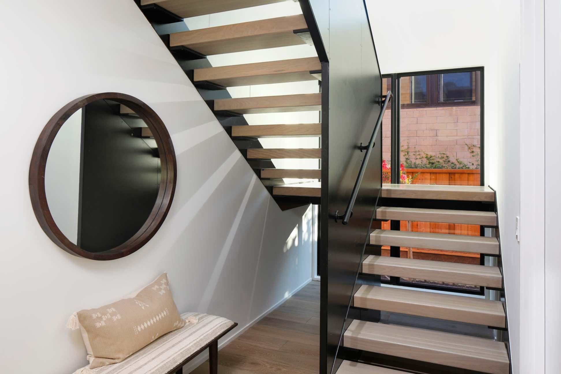 Modern floating steel staircase with wood treads and flush mounted linear lighting