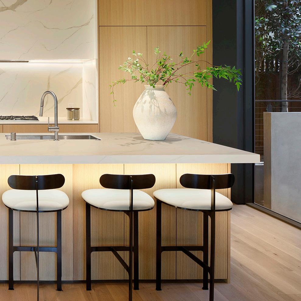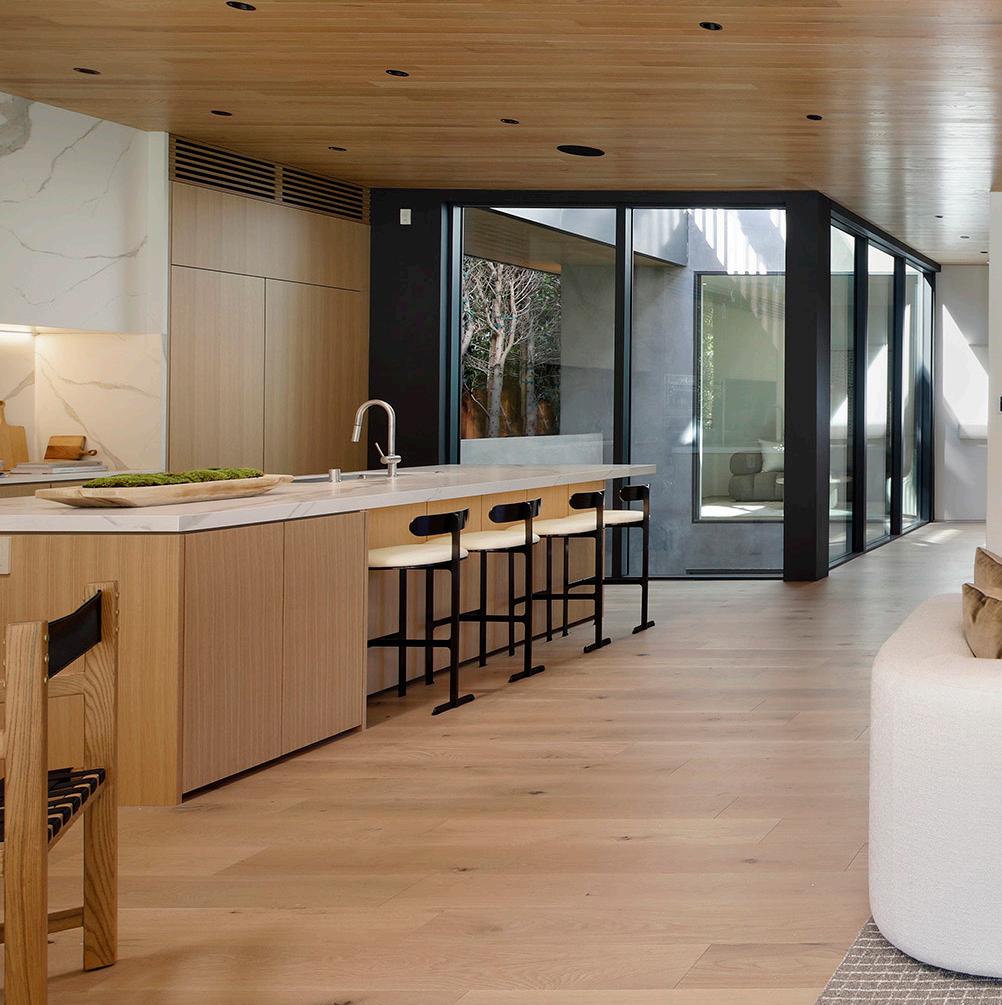 • Wide-plank white oak floors and custom white oak cabinetry throughout