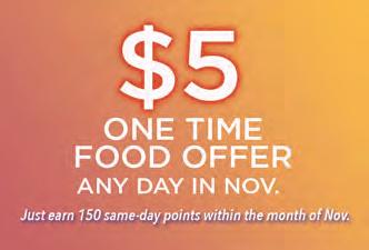 Any day in November receive a one-time $5 off Restaurant voucher for Wind River Casino or Little Wind Casino. Just earn 150 points by playing slot machines using your Rewards Card. Once you earn your points, visit a kiosk, and choose the “One Time $5 Food Offer” promotion button. One prize per patron.
