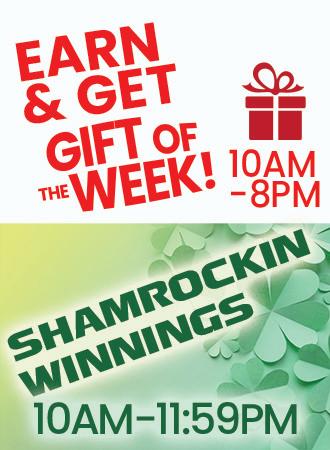 Earn 200, 200, 200,and 200 same-day points by playing slots using your Rewards Card. Once you earn your points, visit a kiosk, and choose the “Shamrockin Winnings” promotion button. The Free Slot Play won will be automatically added to your Rewards Card. Earn up to $80 Free Slot Play per promotional week. Limit of four redemptions per promotional day/per patron.