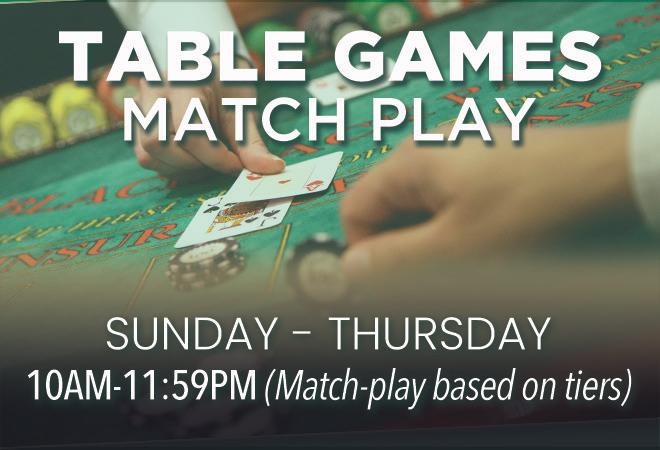 Match-Play values are based on tier. Print out your ticket at the Promotions Kiosk and present the ticket to a dealer at Table Games. Match-Play available for use on the same day only.