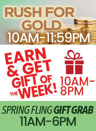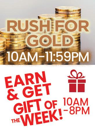 Earn 200, 200, and 200 same-day points by playing slots using your Rewards Card. Once you earn your points, visit a kiosk, and choose the “Rush For Gold” promotion button. The Free Slot Play won will be automatically added to your Rewards Card. Earn up to $60 Free Slot Play per promotional week. Limit of three redemptions per promotional day/per patron.