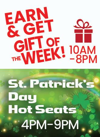 Earn 50 same-day points by playing slots using your Rewards Card to be eligible to be drawn for a Hot Seat. If selected win $50 Free Slot Play and an additional $50 Free Slot Play if you are wearing a green shirt for St. Patrick’s Day!