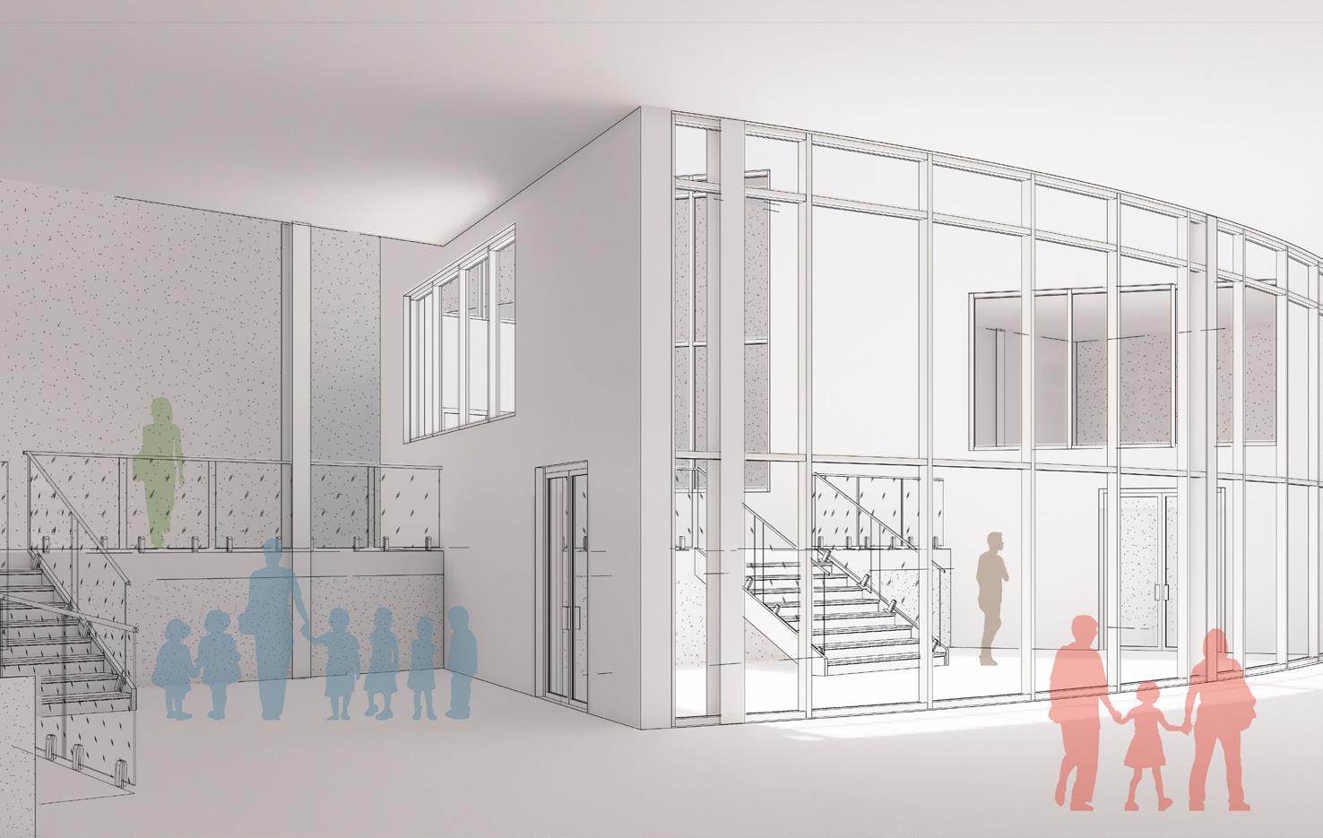 The atrium acts as the nucleus of The Nest, dictating the entire flow of the building. From circulation to structure to programming, all of these elements extend from the atrium, and this centralized hub contains all of the horizontal and vertical circulation. As you circulate through it, the public is able to experience the whole building without disrupting the activities happening within.