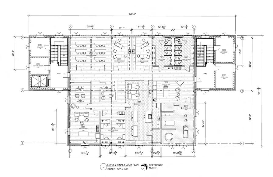 Asthisyearlongprojectcontinued,Iwastaskedwith using all preliminary research and findings to digitally draft a set of design development drawings with relevance to the construction of the Health & Wellness Center. Using digital drafting skills, I produced ten varying plans in AutoCAD to communicate various elements of the design and construction.