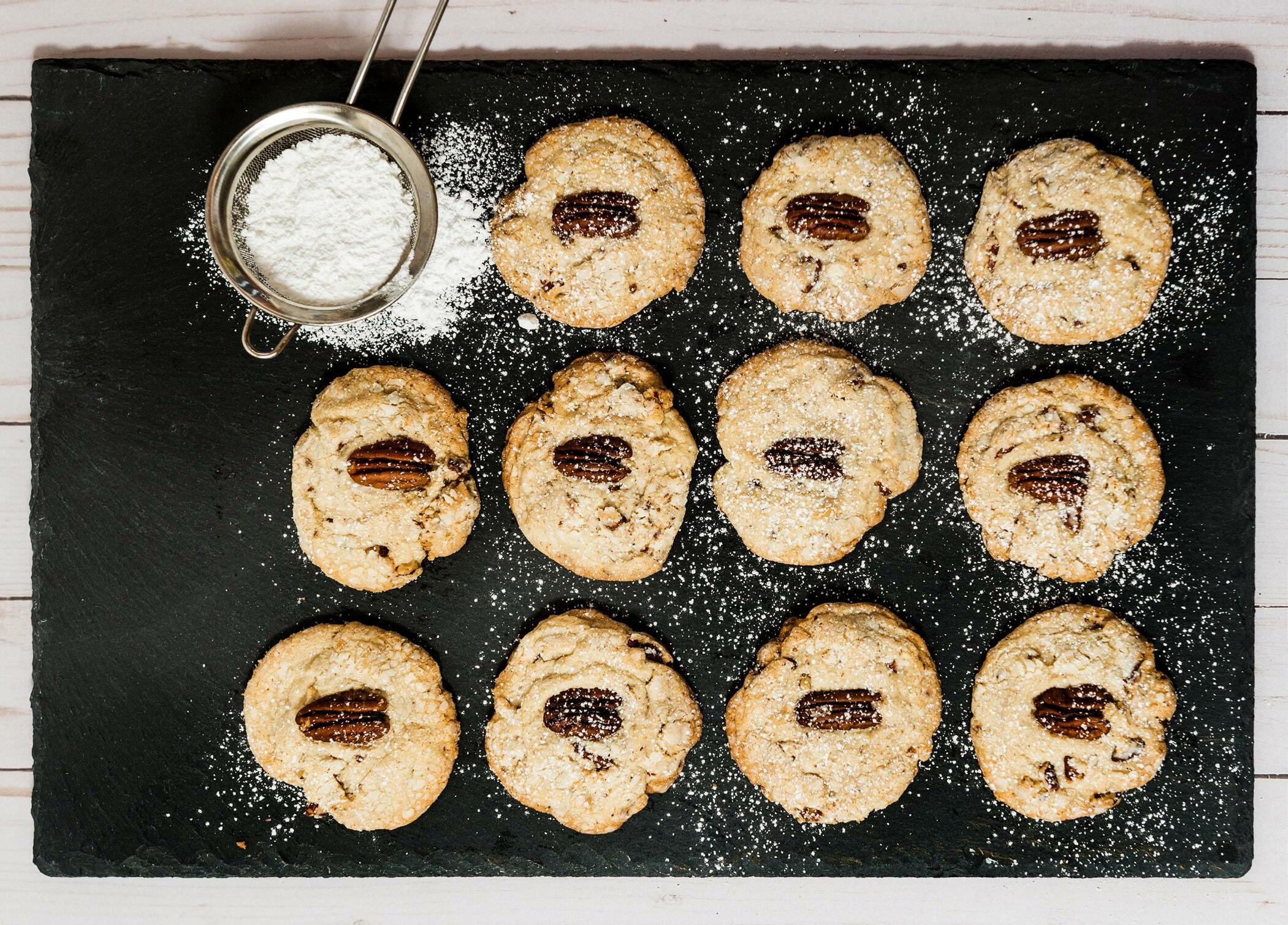 dry measuring cups; level with a knife. Combine flour and cornstarch and gradually add to dough, beating just until blended. Stir in chopped pecans. Turn dough out onto a work surface; knead 2 to 3 times. Divide dough into 30 equal portions (about 1 heaping tablespoon each); roll each portion into a ball. Place remaining ½ cup powdered sugar in a bowl. Roll dough balls in powdered sugar; reserve excess powdered sugar. Arrange sugar-coated dough balls 2 inches apart on baking sheets lined with parchment paper (or a silicone baking mat). Press 1 pecan half in the center of each cookie. Freeze for 15 minutes. Bake for about 12 to 15 minutes, or until the bottoms of cookies are lightly browned. Let cookies cool on hot pans 4 to 5 minutes. Remove to wire racks; cool completely. Place remaining powdered sugar in fine-mesh sieve and dust tops of cookies with powdered sugar. Keep cookies in a parchment paper-lined airtight container for up to 2 weeks and freeze for up to 3 months.