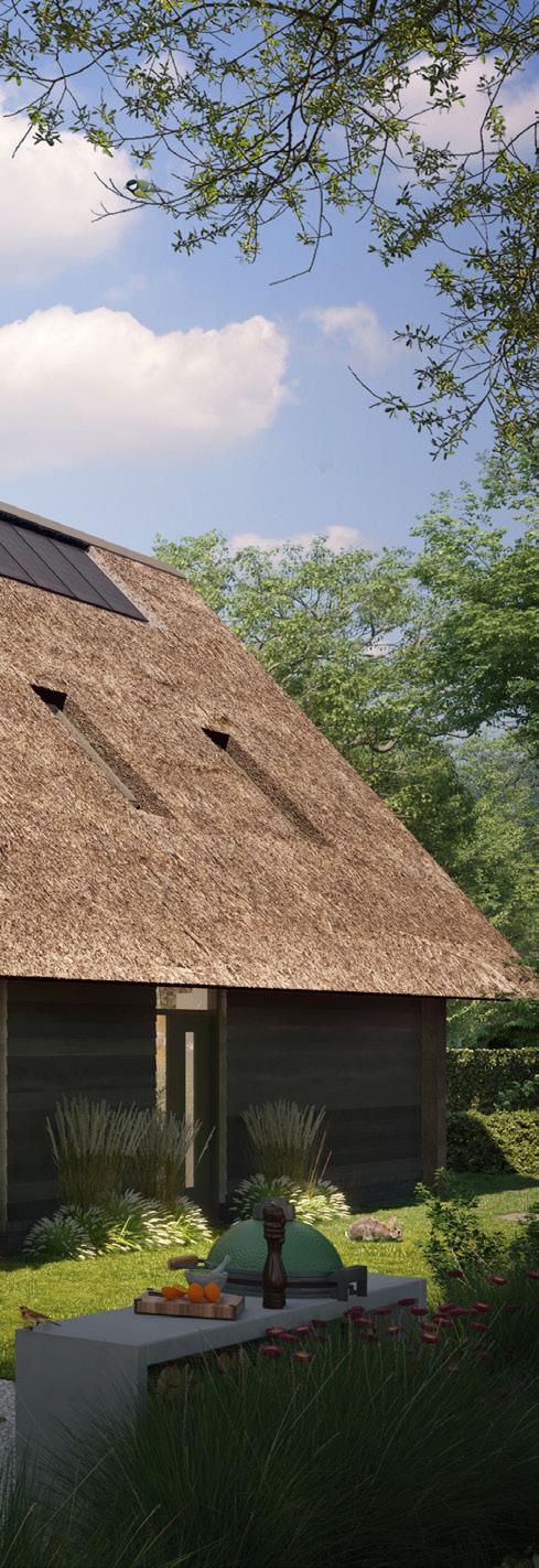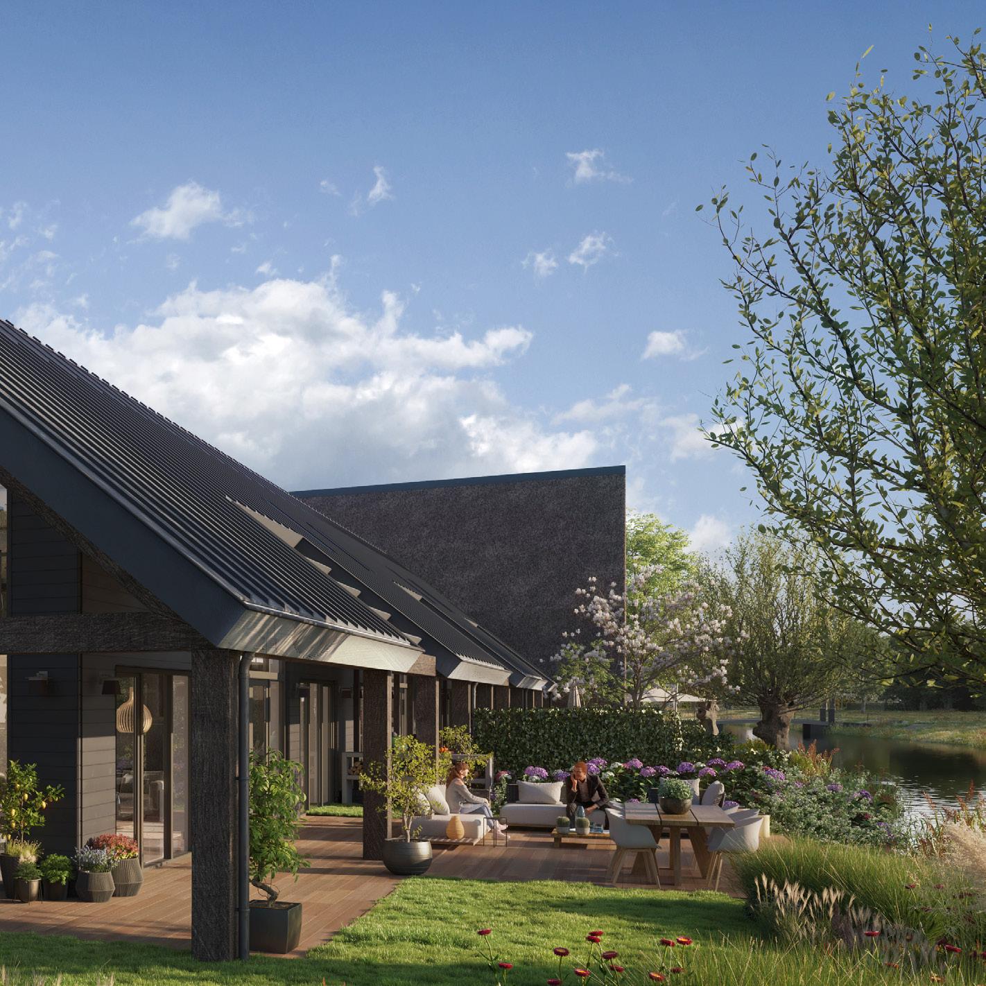 De Boerderij Woningen zijn eigentijds, met op de kop het markante hoofdhuis met riet bekleed en wat hoger dan het achtergelegen ‘staldeel’. Ook het dakoverstek op de robuuste houten kolommen geeft deze Boerderij Woningen een eigen en luxe uitstraling met veranda en terras aan het water. De woningen hebben allen aan dezelfde zijde de entree die door middel van een voetpad bereikbaar is.