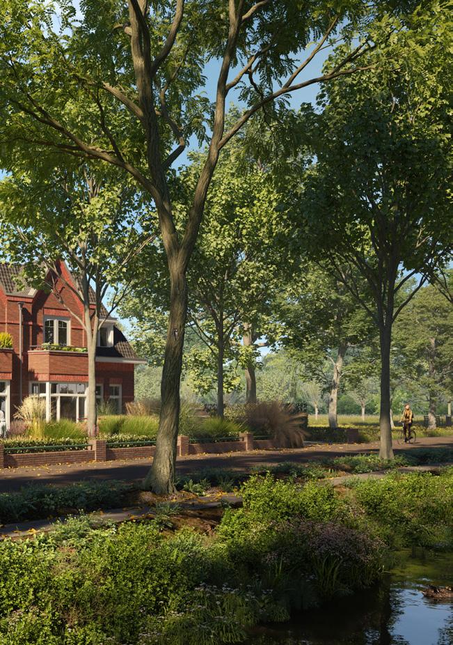 Landschapsarchitect Wijnand Bouw van BoschSlabbers ontwerpt de toekomst met oog voor het heden en gevoel voor de historie, zodat het landschap een uniek en boeiend verhaal kan blijven vertellen. Het is dan ook een bijzondere plek aan de landgoederenzone, op de strandwal. Eigenlijk oude duinen met ontsluitingswegen richting Delft. Aan de Van Vredenburchweg staan de grote buitens. In het gebied waar wij het over hebben bevonden zich voorname landhuizen met boerderijen. Vandaar de opzet van een buitenplaats met oprijlaan en ruim bemeten spiegelvijver.