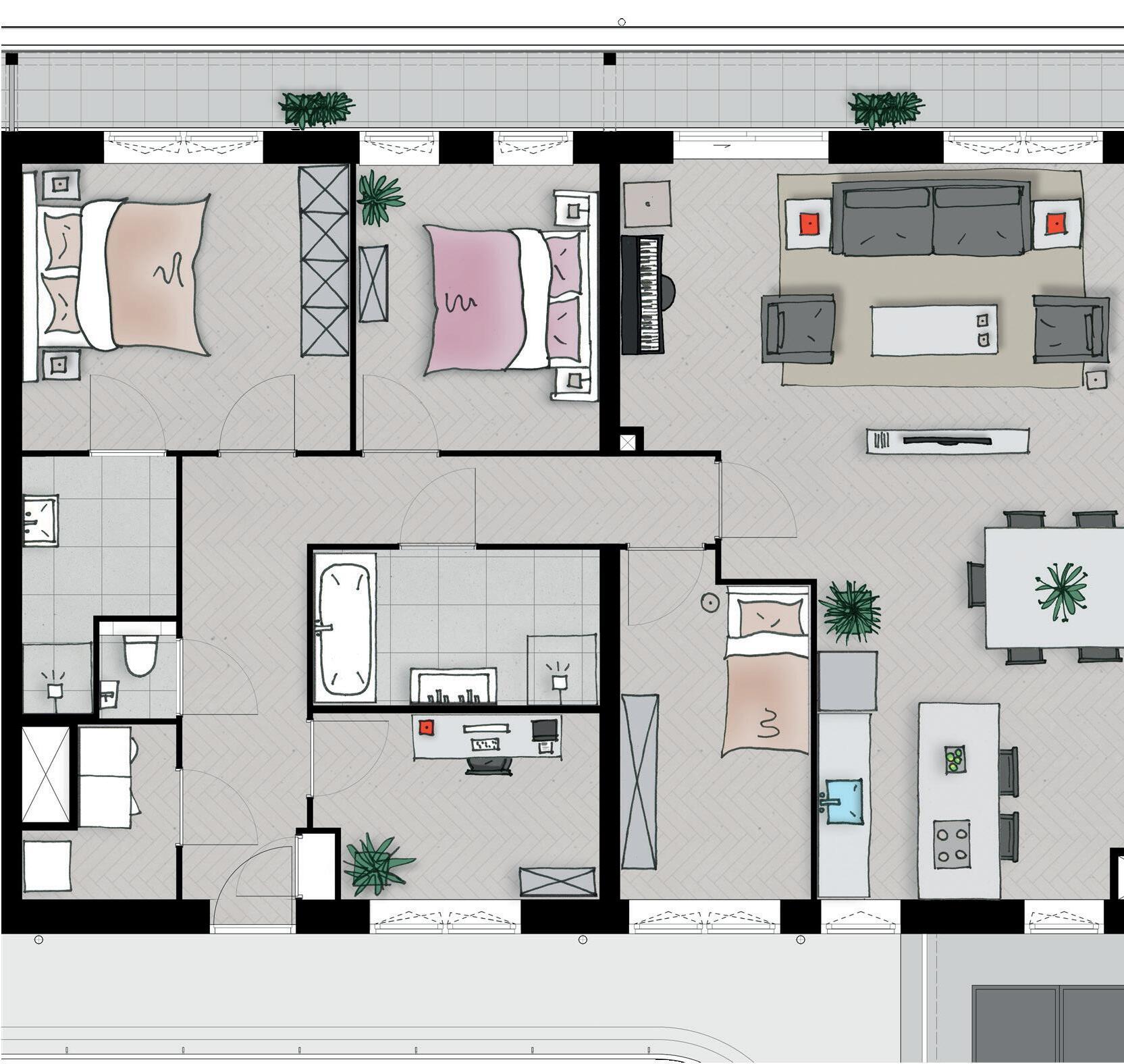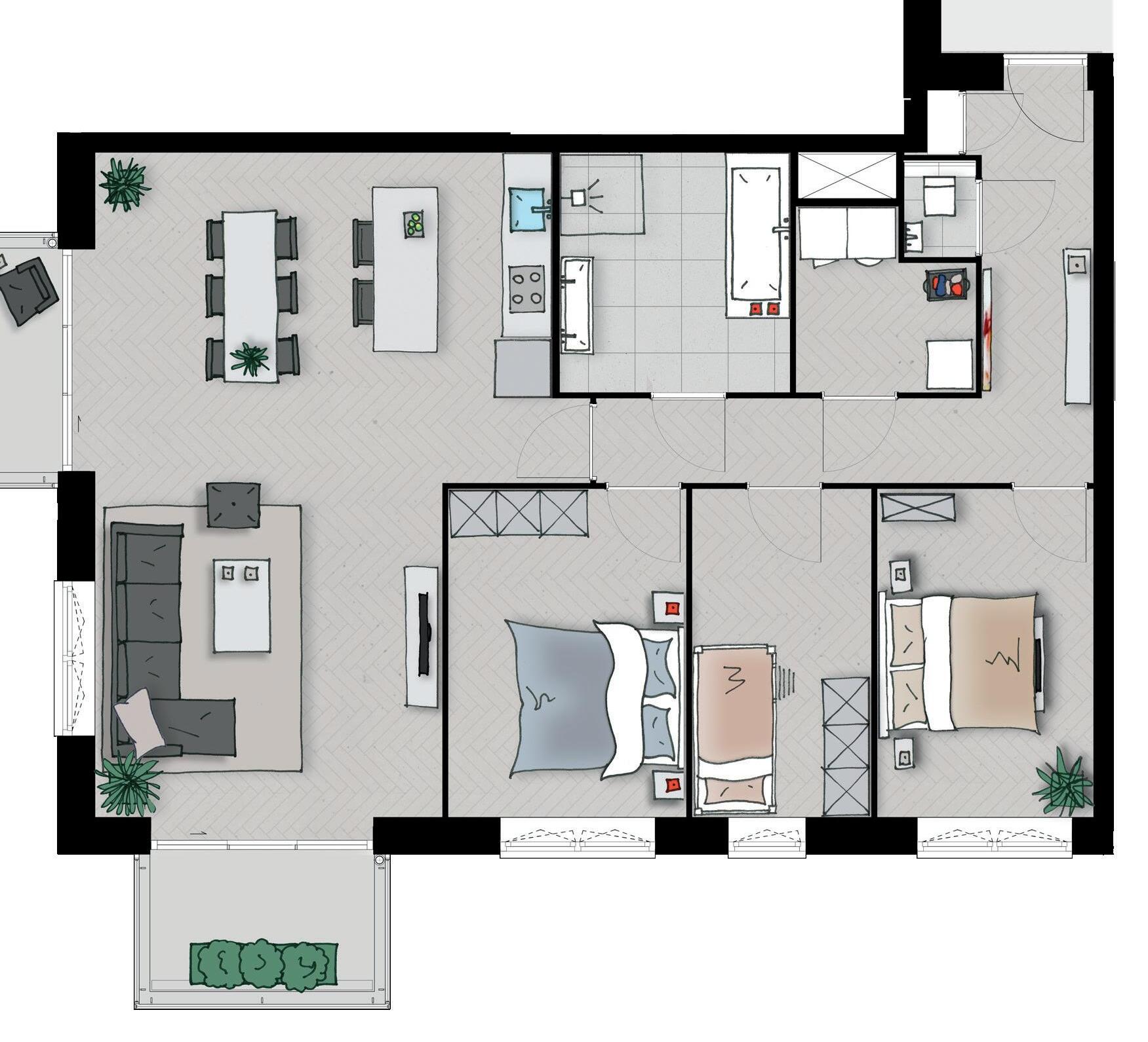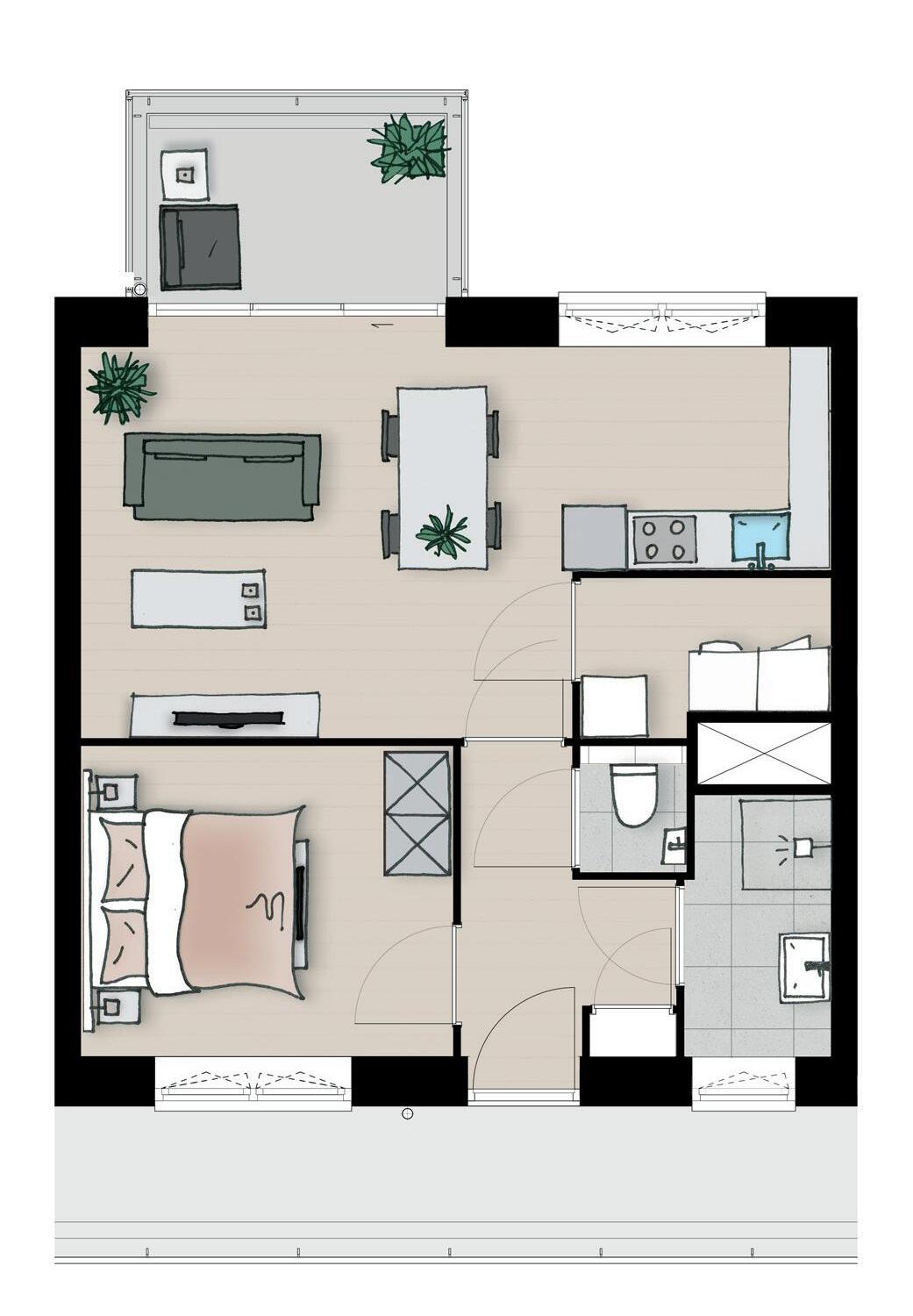De in deze brochure opgenomen sfeerplattegronden zijn kenmerkend getekend. Dit om je een idee te geven over de indeling van het betreffende appartementtype. De technische verkooptekeningen (1:50) zijn meer in detail uitgewerkt en zijn dus leidend voor het eindresultaat.