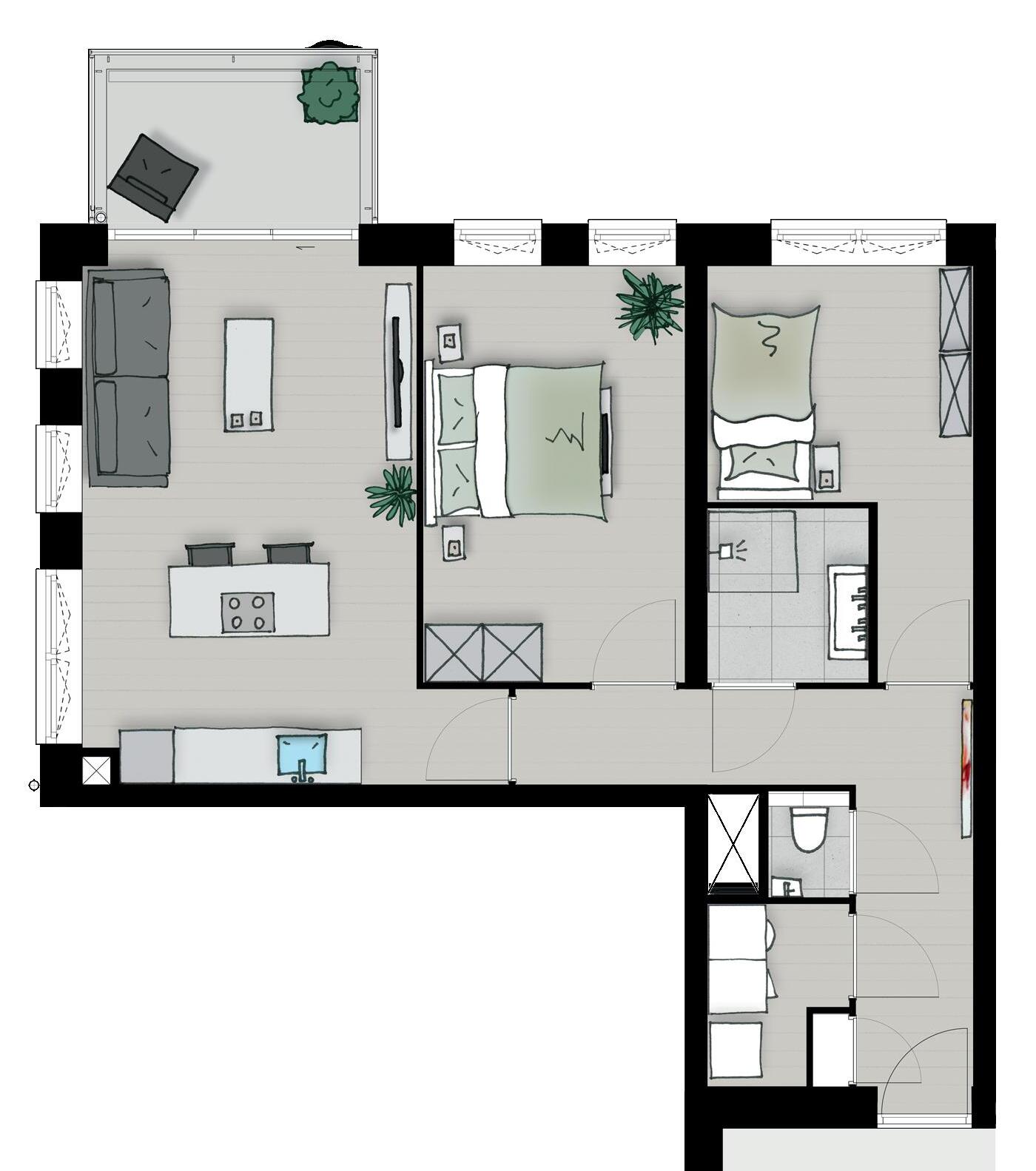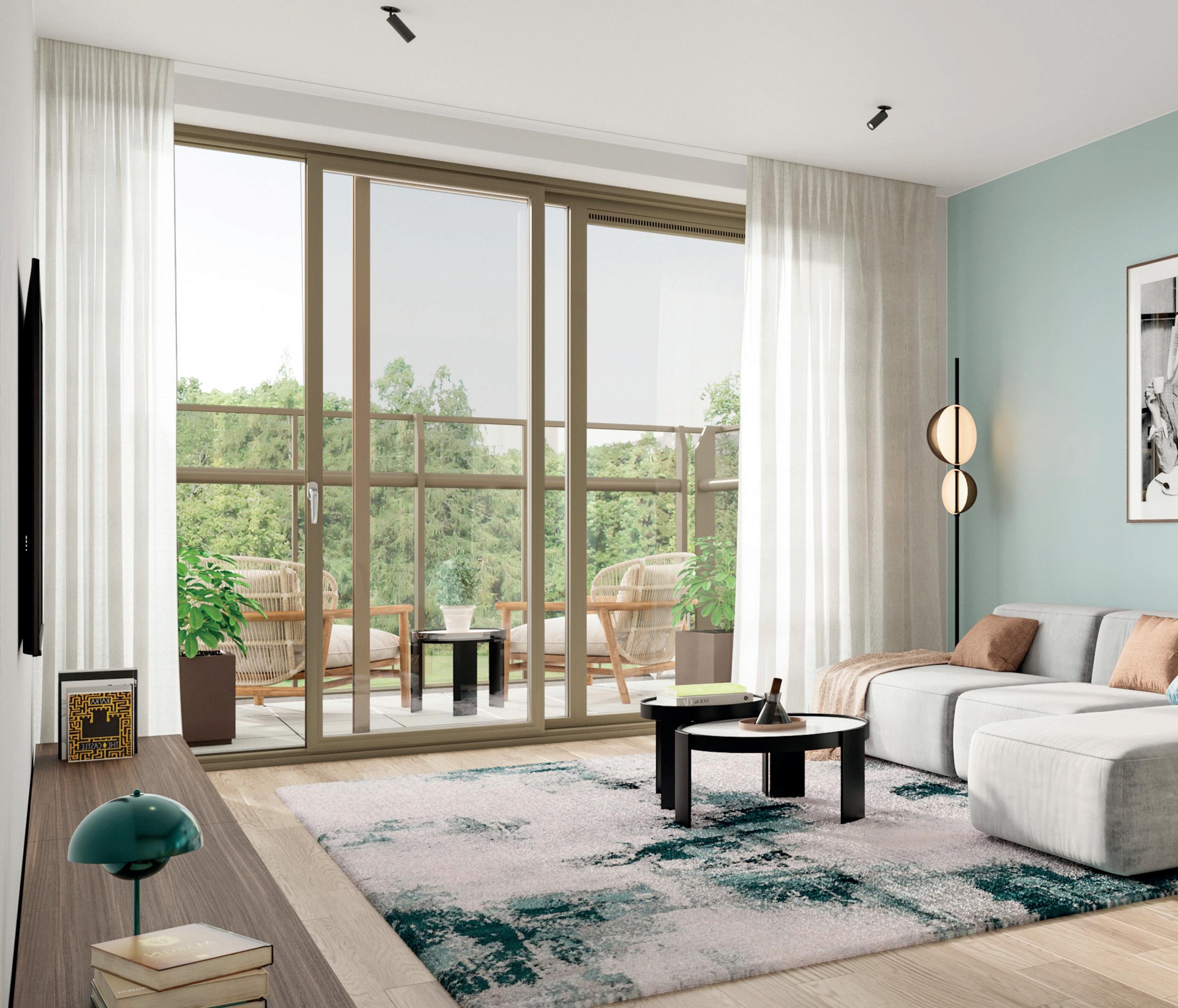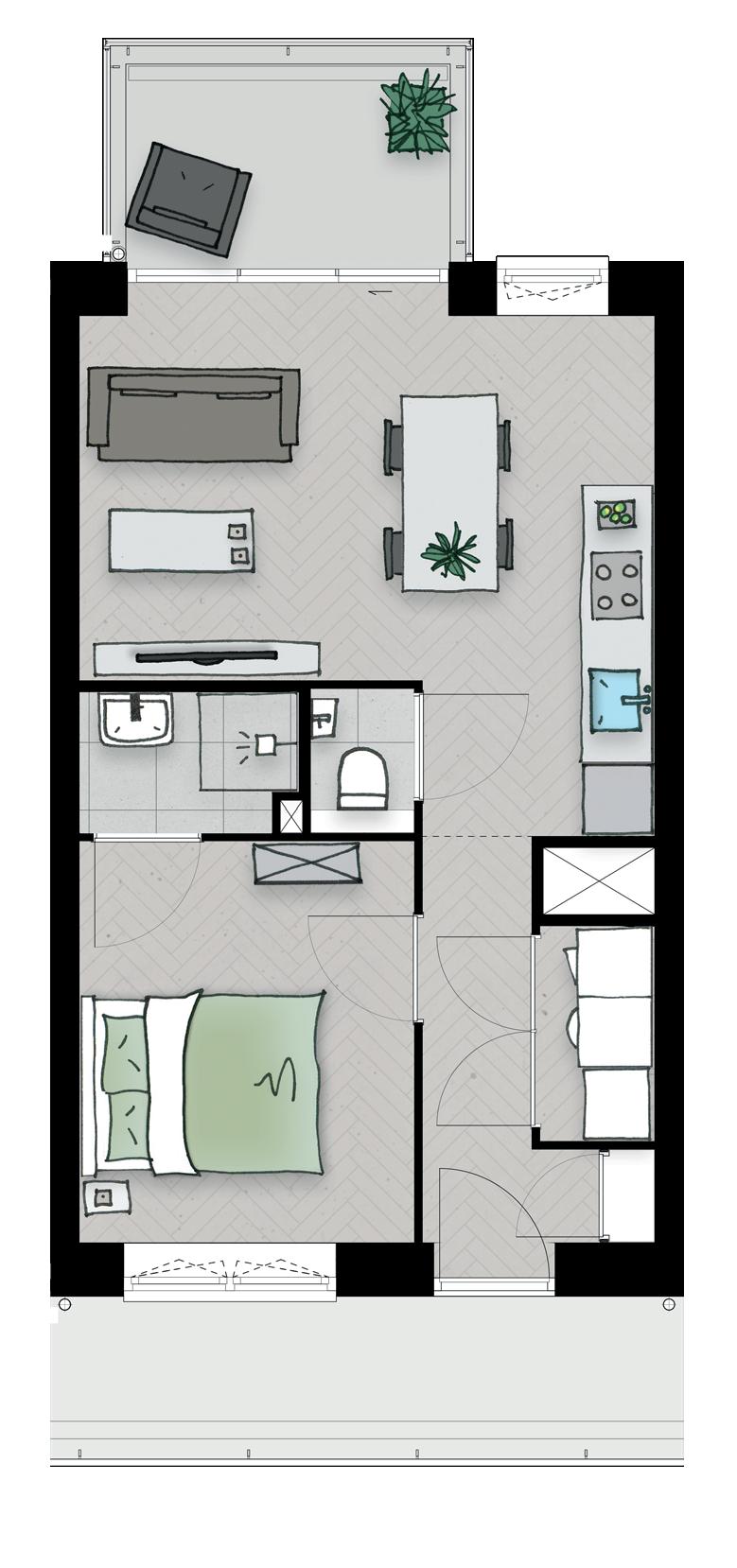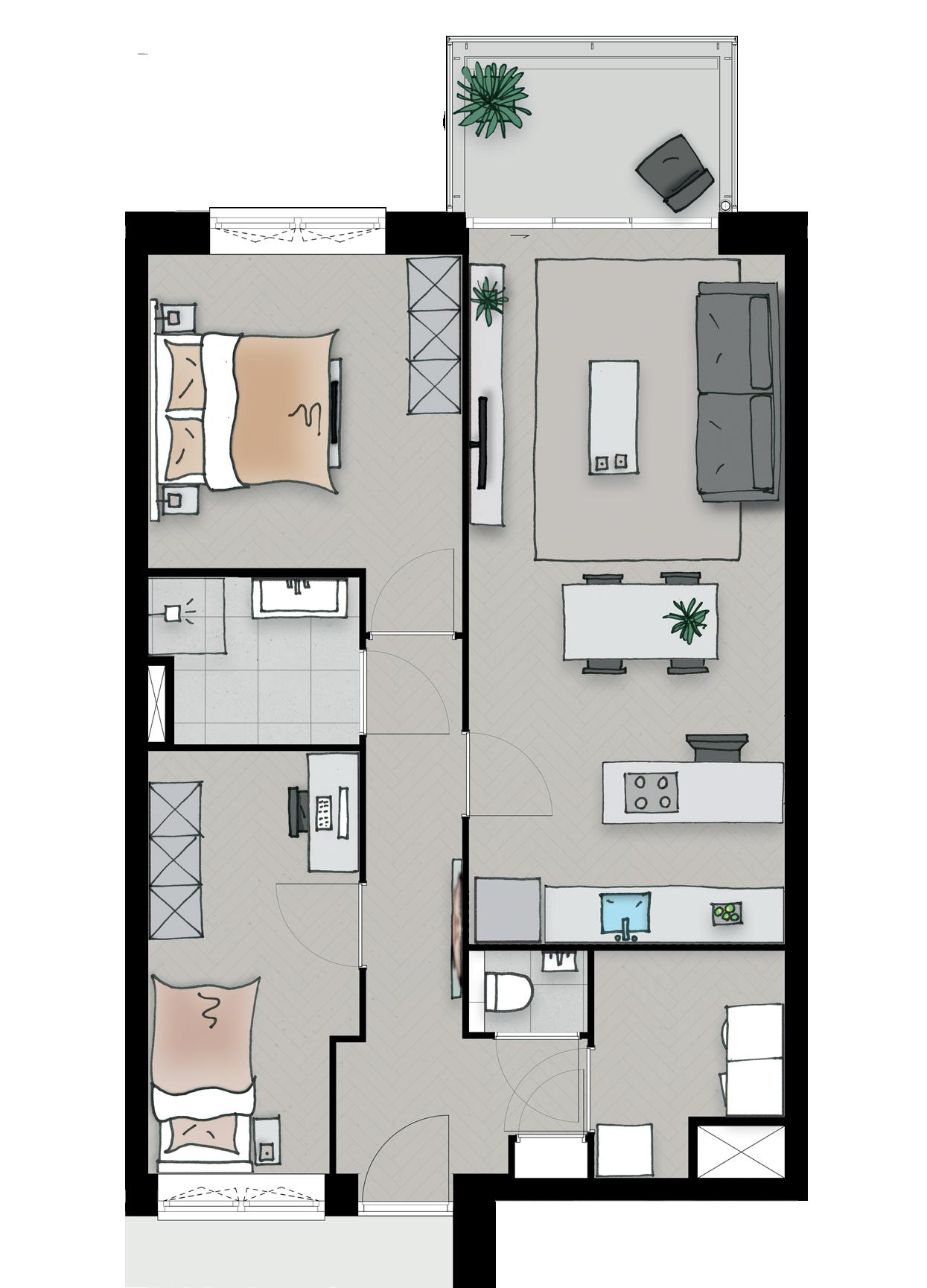 De in deze brochure opgenomen sfeerplattegronden zijn kenmerkend getekend. Dit om je een idee te geven over de indeling van het betreffende appartementtype. De technische verkooptekeningen (1:50) zijn meer in detail uitgewerkt en zijn dus leidend voor het eindresultaat.