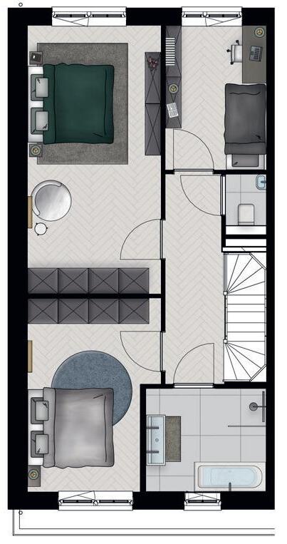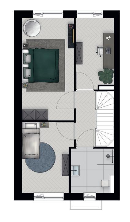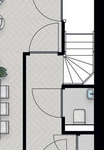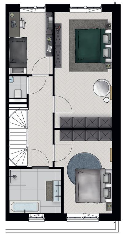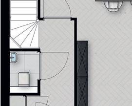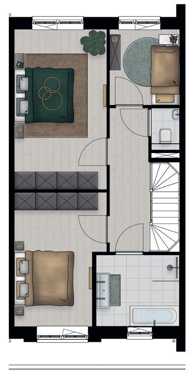 begane grond met een separaat toilet en toegang tot een ruime living met open keukenopstelling van circa 39 m² tot circa 44 m². Sommige hoekhuizen kennen een extra bijzondere indeling, dankzij een typerende zijgevel of openslaande deuren naar buiten toe. Vanuit de living heb je toegang tot een ruime achtertuin van circa 10 meter diep met een handige berging. Afhankelijk van het bouwnummer dat je kiest, is jouw tuin gelegen op het noorden of zuidwesten. Via de vurenhouten trap in de hal kom je op de eerste verdieping, waar in