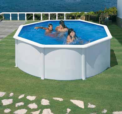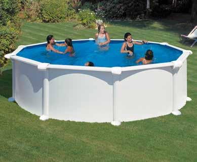 Acero blanco. Incluye depuradora con filtro de arena, escalera de seguridad 2x3 peldaños y tapiz de suelo. Med.: Ø 460x132 cm.